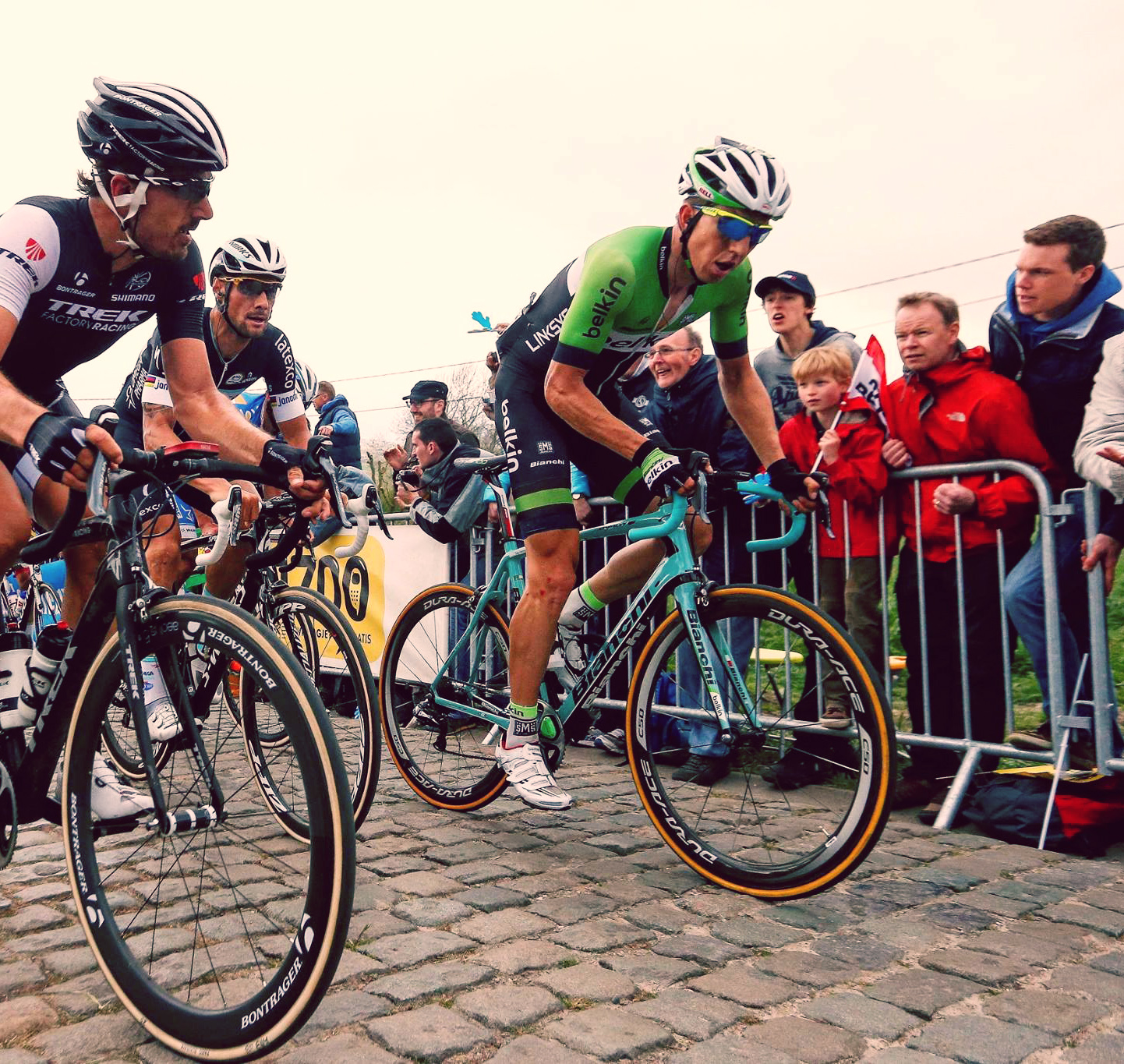 sep_rondeDavanti, Greg e Stijn sanno di essere in balia dei secondi che vanno e vengono. Arrivano ad essere cinquantasei, quei secondi. Vicini, così vicini al minuto che la speranza comincia ad affiorare, tremante come le biciclette scosse dallo sforzo. Ancora un po’, ancora fino all’Oude Kwaremont e, con un discreto vantaggio, potrebbero farcela. Greg tenta di togliersi da ruota il compagno: non gli serve, non gli è mai servito. Tanto vale tentare da solo. Quel vento lo conosce bene, quell’aria di casa l’ha sentita tante volte, le strisce di nuvole grigie e blu all’orizzonte sono familiari. Ma Vandembergh non cede, oramai né Stybar, né Terpstra possono rientrare, ha il via libera, la sua opportunità di giocarsela. E’ il sangue che chiama da quel traguardo, un richiamo viscerale che è dentro da sempre, la tempra del Nord che urla di non smettere di pedalare, di stare sotto, di non perdere niente, a costo di svuotare le gambe.