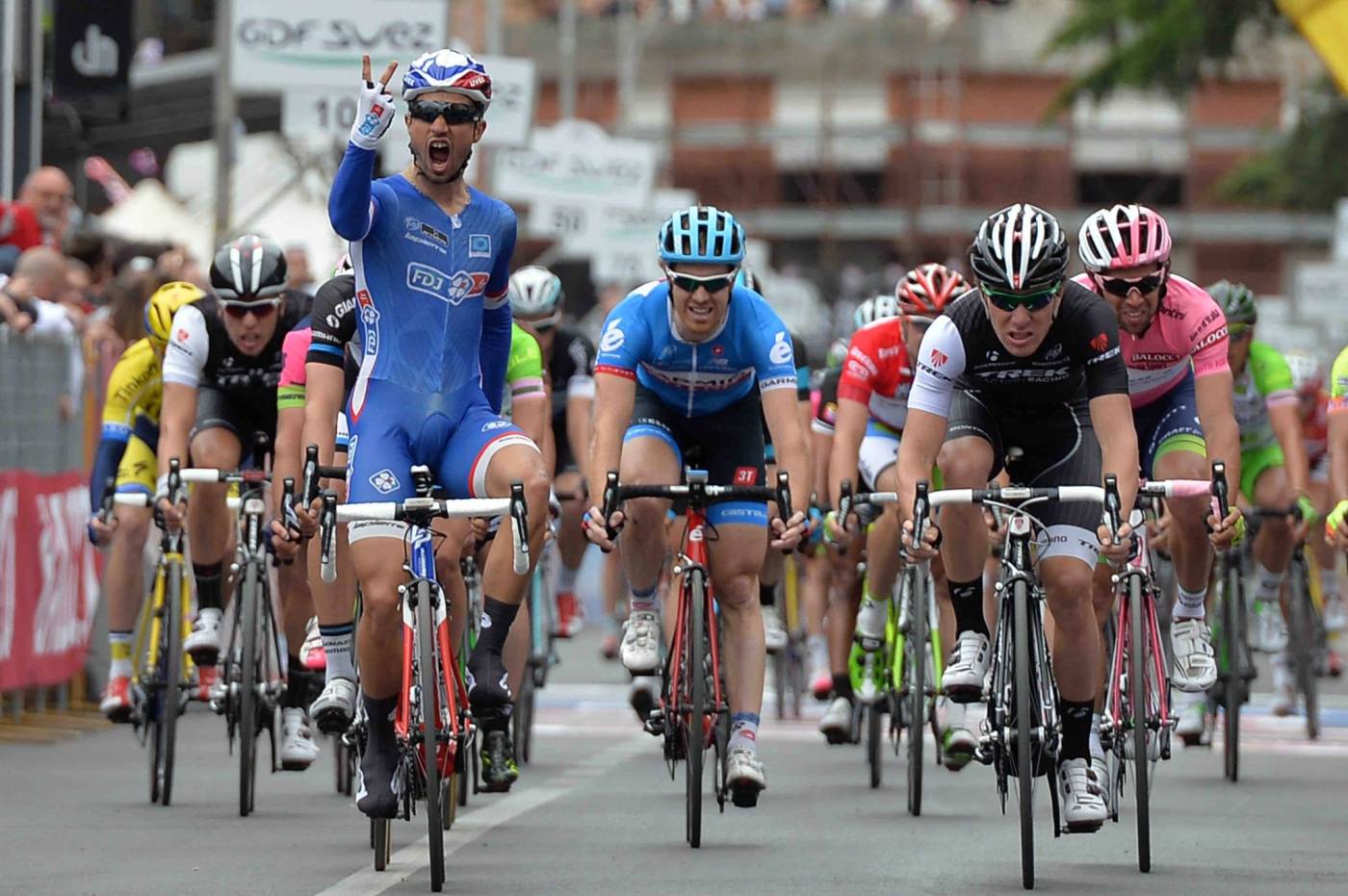 Bastava poco, bastavano ancora un po’ di secondi, ancora un po’ di fortuna. E invece quell’ultimo tratto d’asfalto diventa terreno di caccia per i velocisti. I treni si mescolano, qualcuno battezza la ruota di Nizzolo, qualcuno quella di Viviani e poi cambia ancora. Nizzolo, Bouhanni, Nizzolo, Bouhanni. Ancora Nacer Bouhanni per la seconda volta. Mezza ruota, forse anche meno.