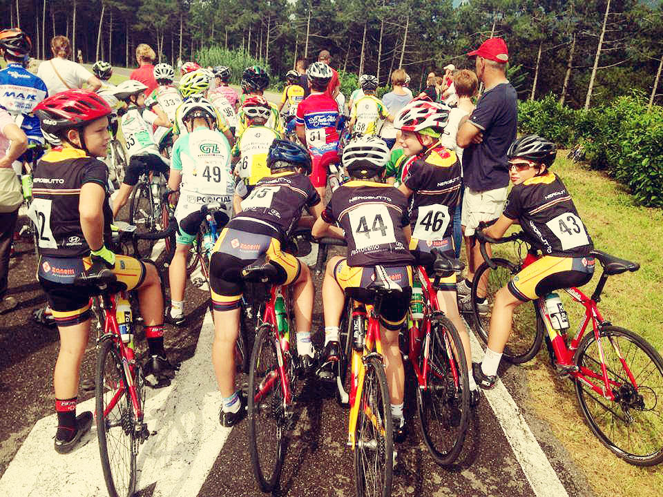 Piccole cose che poi diventano grandi, crescono assieme a loro, come una corteccia. E’ un po’ una seconda pelle questa. Niente tattiche di gara complicate, si imparano con il tempo. Saper stare in gruppo, tenere la bici, prendere una borraccia ecco quello che conta quando si comincia appena a stare in equilibrio su due ruote con gli scarpini agganciati ai pedali. Costruire un rapporto simbiotico con la bicicletta, come se fosse una parte del corpo. E’ un gioco che prepara alla vita. E i traguardi, raggiunti o non raggiunti, fanno il resto. Imparano cosa vuol dire costruire un sogno, anche guardando quelli degli altri. “Qui a Borgo” spiega Caterina, “abbiamo la fortuna di avere Matteo Trentin, il nostro campione. Ogni tanto viene a trovarci durante gli allenamenti, sta un po’ con i bambini. In realtà quelli che seguono assiduamente il ciclismo in TV sono pochi. Tutti gli altri si sono iscritti per la pura passione verso l’andare in bicicletta, per sana competizione. Però tifosi lo si diventa. Quando cominciano ad essere più grandicelli, vedono che l’amico di sempre passa nella categoria esordiente e lo seguono durante le corse, si appassionano anche al professionismo e iniziano a guardarlo anche in televisione. Quando Matteo ha vinto al Tour abbiamo saltato l’allenamento e siamo andati a casa dei suoi genitori a fare festa e poi a mangiare un gelato. Gli ho spiegato che cosa era successo, che aveva vinto una tappa di una gara molto importante, conosciuta in tutto il mondo, gli ho chiesto cosa volessero fare da grandi. E loro mi ascoltavano a bocca aperta con il gelato gocciolante in mano.”