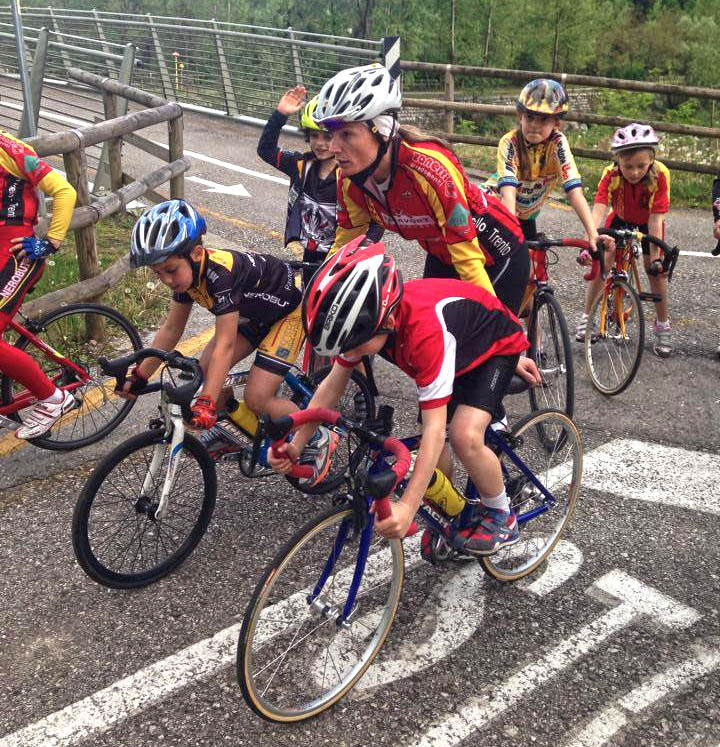 Caterina Giurato allena i giovanissimi del Veloce Club Borgo A.S.D. di Borgo Valsugana. Assieme a suo marito, Stefano Casagranda, ex pro, segue i ragazzini dai sei ai dodici anni, stagione per stagione. E anche se molto spesso i genitori, iscrivendo i figli ad una società, sognano già di vederli al Giro d’Italia, Caterina insiste nel dire che il suo non è esattamente un ruolo da DS, piuttosto da educatrice. E’ un mondo quasi a parte, allegro e ingenuo, con tutte quelle biciclettine piccole così che per loro, per i bambini, sono come Ferrari luccicanti. “Sono pochi i bambini che arrivano spinti da un eroe che vedono in televisione” spiega Caterina. “Si iscrivono perché vogliono provare a salire su una bicicletta da corsa. Rappresenta il nuovo, il diverso, un giocattolo prezioso. Ed è giusto così. Guai se fossero spinti da altro.”