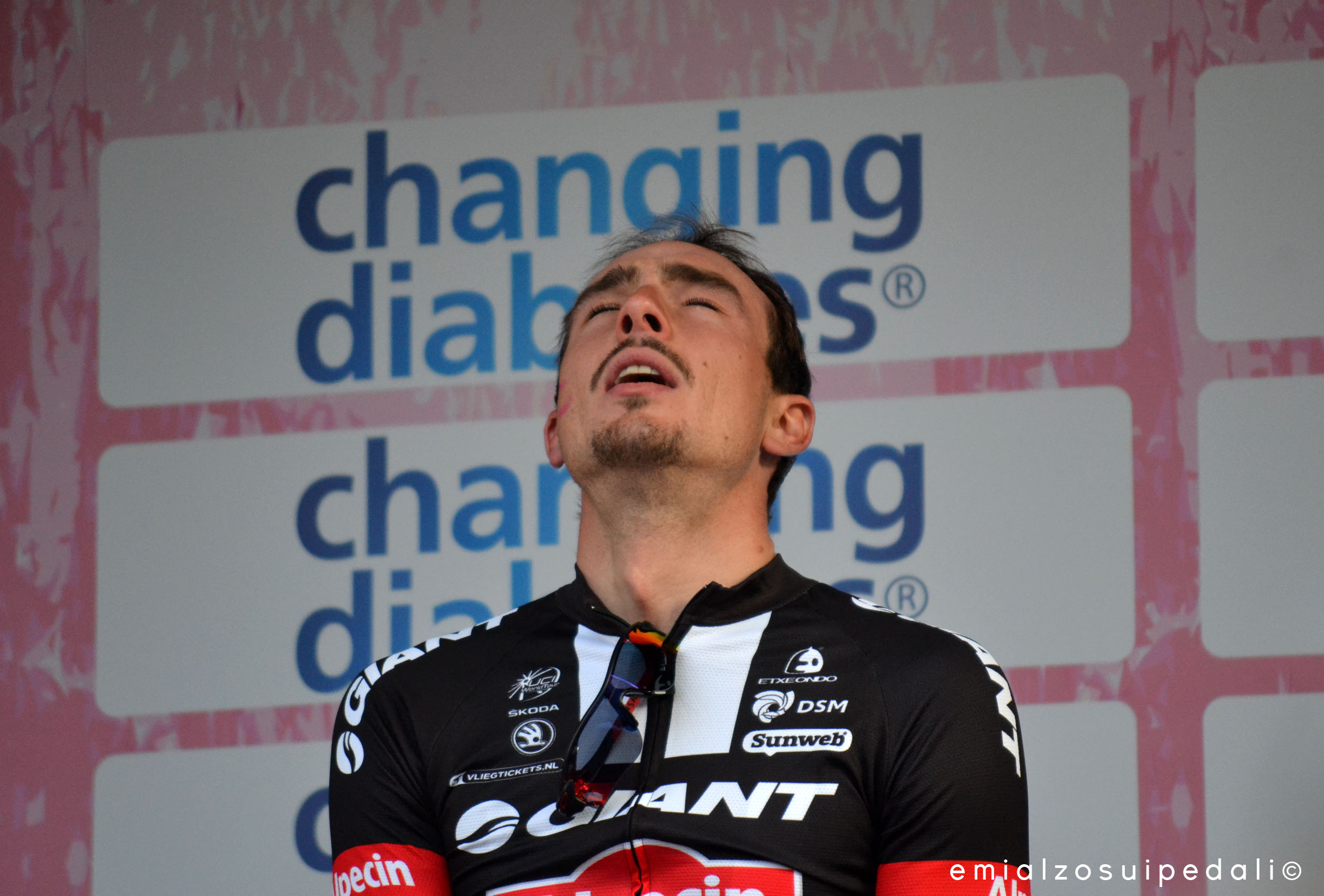 Gilbert con la manica della divisa strappata e la pelle e il sangue della strisciata contro l’asfalto. Daniel col volto lucido e gli occhi arrossati dalla fatica dove l’azzurro si vede ancor di più. Paolini con le guance scavate dalla fatica delle trenate. Gerald impassibile, con la sua bici che ora ha due ruote ma non ha placato la sua delusione cocente. Via ai pullman perché domani è già un altro giorno e la sera dopo la Sanremo serve o per festeggiare o per riposare senza nessun altro pensiero. Pozze di pioggia recente in cui si riflette il cielo, le sagome dei pullman, i meccanici che lavano le bici. E sul podio c’è Dege che alza le braccia, le rughe della fatica sono andate via tutte, le ha mandate via il sorriso, la strana consapevolezza di avercela fatta. Aggrappati alle transenne ci sono anche i suoi tifosi del Guilty 76 di Francoforte. Son venuti qui dalla Germania perché forse sapevano già tutto. Sapevano che stava bene, che avrebbe riscattato la caduta dell’anno scorso, che semplicemente Dege voleva quella corsa, l’aveva promesso a sé stesso. I trionfi sono così difficili da raccontare. La felicità è una cosa che va goduta senza troppe parole. E nel silenzio di quel frastuono sotto il podio, lui si prende la statuetta, la guarda e la bacia con gli occhi chiusi. Si toglie il cappellino per l’inno. E si commuove, ha gli occhi lucidi.