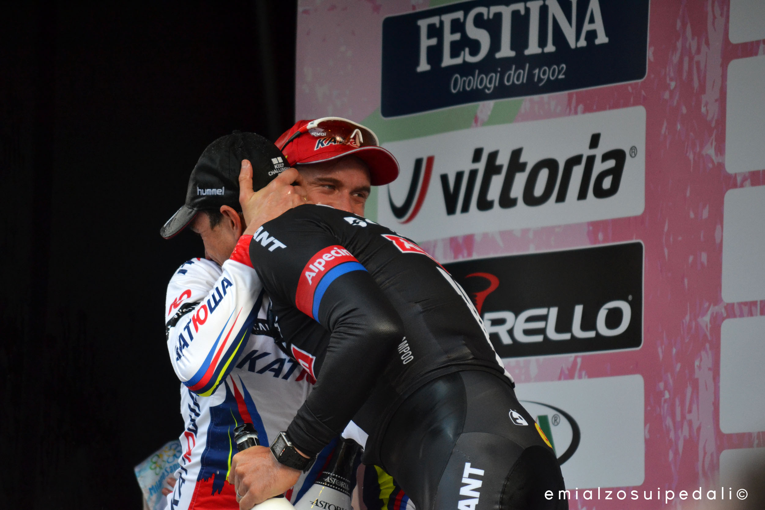Sa che lì in mezzo ci sono anche i suoi amici, i suoi ragazzi. Sono lì per lui e hanno voglia di abbracciarlo, di dirgli che quei chilometri li rifarebbero anche cento altre volte pur di restare ancora un istante così, a guardarlo mentre si asciuga gli occhi con una mano e fa vedere a tutto il mondo che si piange di fatica, si piange di felicità. Ich Liebe Dich. Che il ciclismo è amore senza sconti. Nessuna tempesta, nessuna caduta, nessuna delusione può scalfirlo. Ich Liebe Dich. So così poche parole in tedesco ma, nonostante tutti dicano che sia una lingua dura, senza dolcezze, io credo che non esista un Ti amo detto meglio di questo. Tre parole che quando le pronunci sono tutte attaccate. Qui lo siamo tutti: sotto il podio, alle transenne. Tutti spalla spalla. Innamorati per sempre.