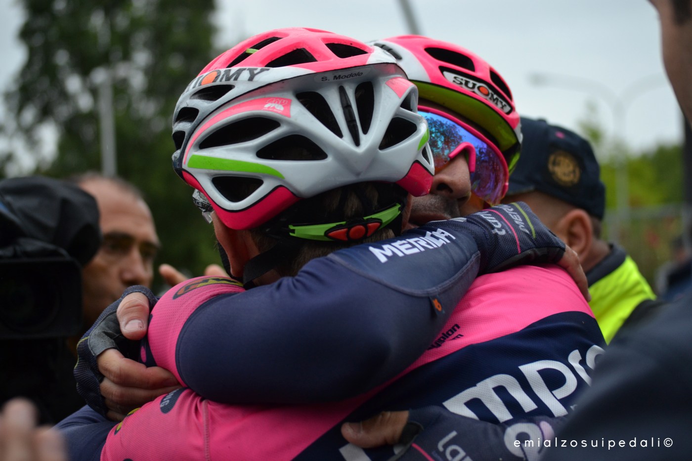 E l’urlo. Un abbraccio forte come un fiume in piena, sotto questa pioggia che forse vuole smettere proprio ora. Ora che sono arrivati tutti con la faccia nera di fango tirato su dalle ruote. Un abbraccio senza fine. Sacha a Max, il suo ultimo uomo. Quella volata vinta è anche un po’ sua, anche un po’ della squadra. Un abbraccio forte a chi si tiene il capitano a ruota per proteggerlo, pesce che poi devia il corso del fiume per farlo arrivare al mare.