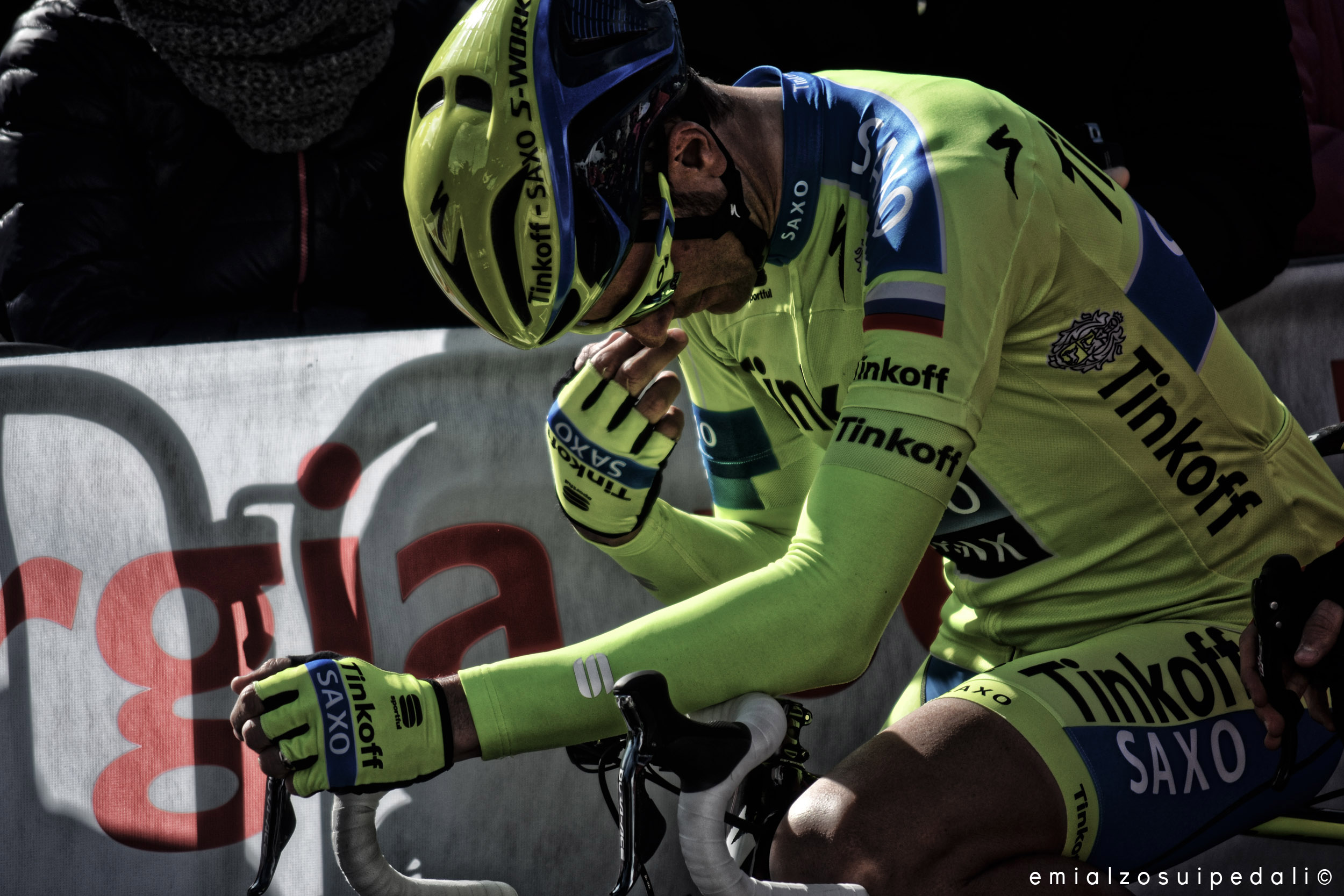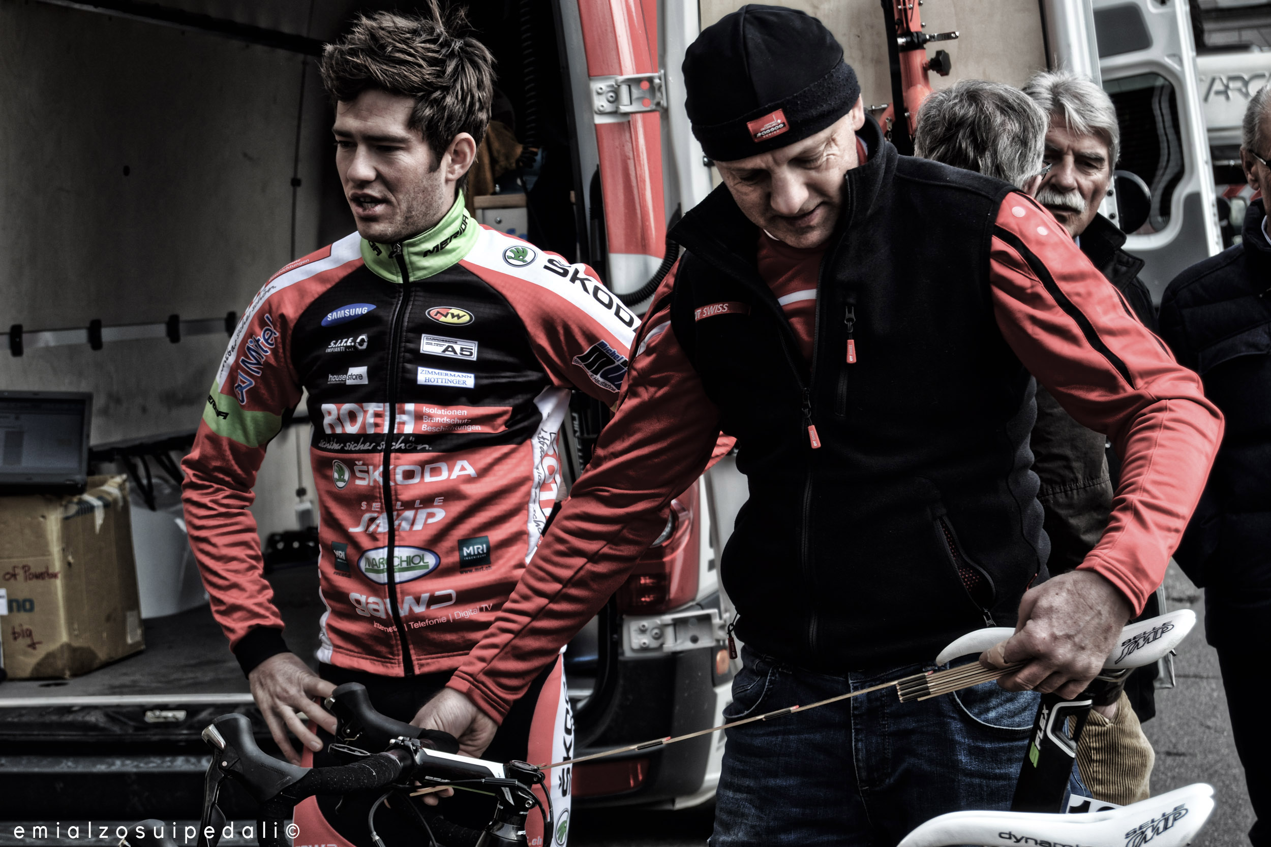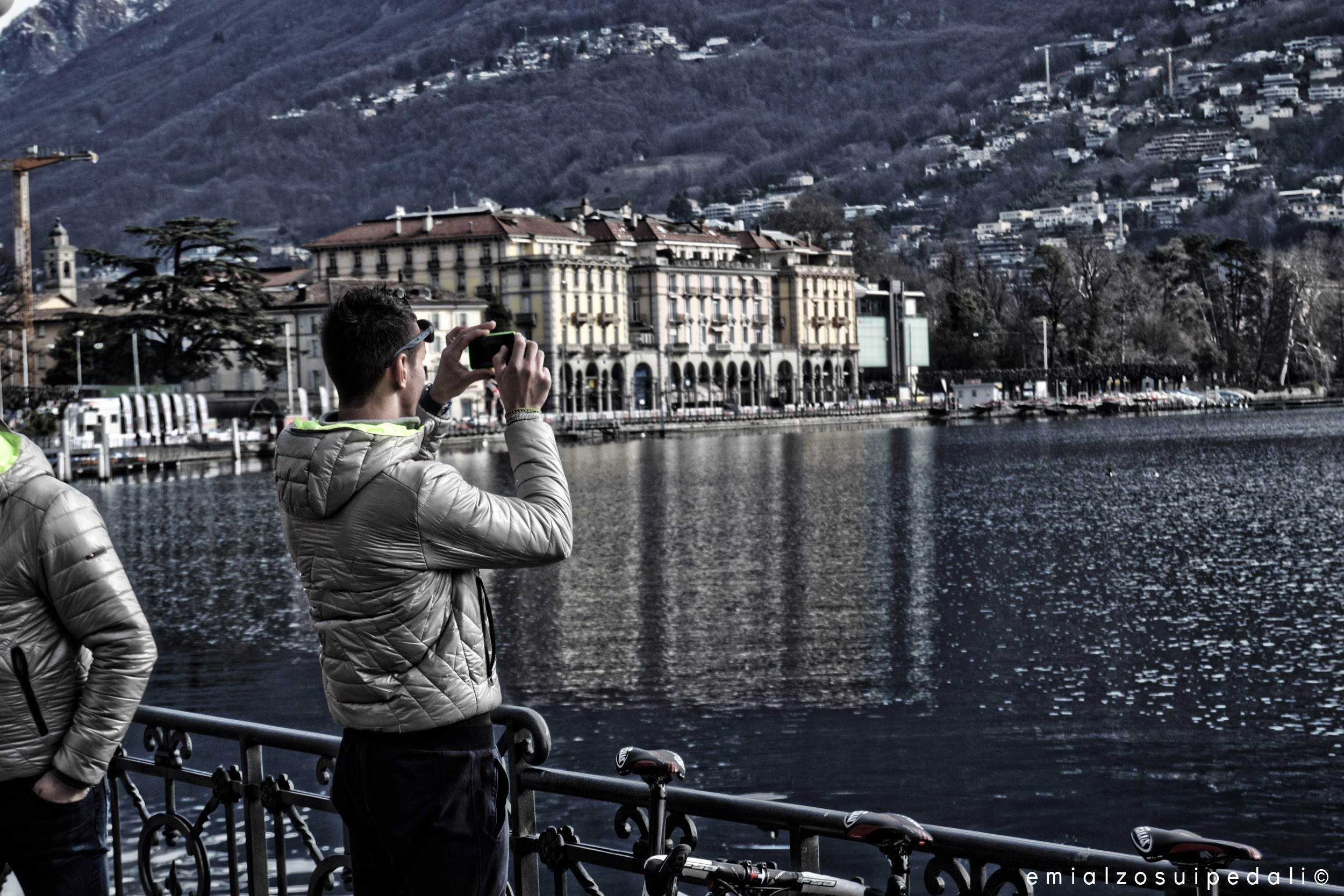 I bambini corrono e i meccanici anche. Attorno alle bici, mentre il sole fa brillare la città che si affaccia sull’acqua tranquilla. Un cigno bianco si arrampica sulla darsena, una china di una barca, pedalò tutti in fila in attesa dell’estate. I ragazzi scendono dai pullman ancora in tuta, fanno le foto, tornano su, ritornano in divisa. C’è il sole. Il lago è una lastra grigio azzurro intenso. C’è il suo odore di mezza stagione, di risacca, di alghe, di muschi sui muretti che respirano aria e acqua dolce allo stesso tempo.