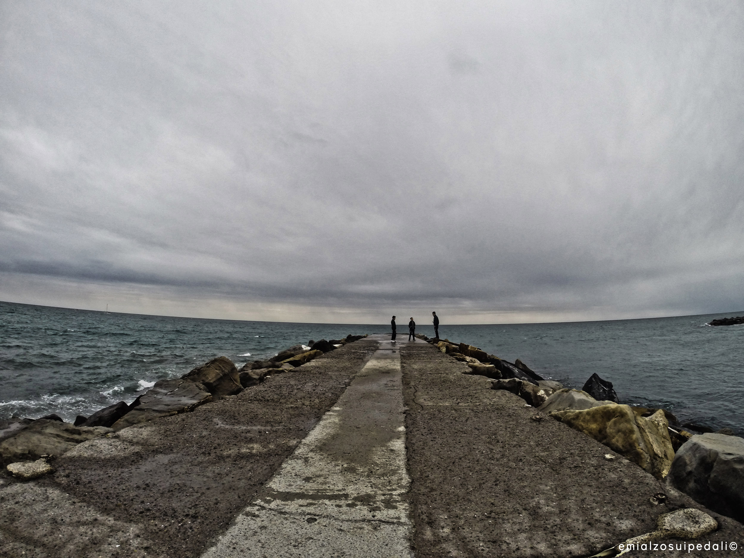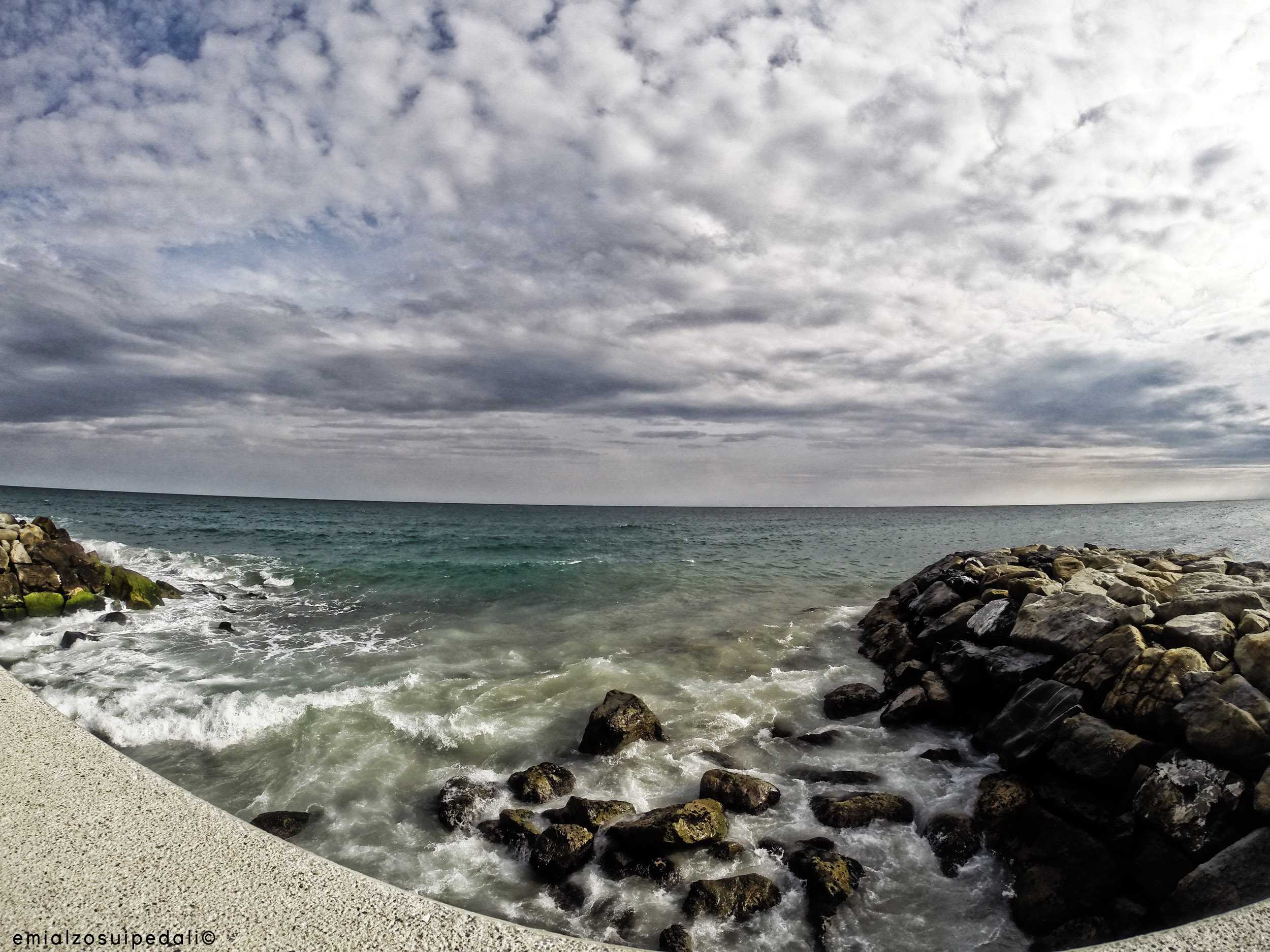 Vento che spazza via tutto, vento che chiama il sole che fa lunghe le ombre sulle piazze. Stralci di nuvole e di azzurro. Azzurro intenso, intenso come il verde acqua del mare che corteggia gli scogli con le sue onde di madreperla. Si schianta furioso, rimane la spuma a gorgogliare calma là sotto e poi di nuovo. Ecco il canto di un pomeriggio.