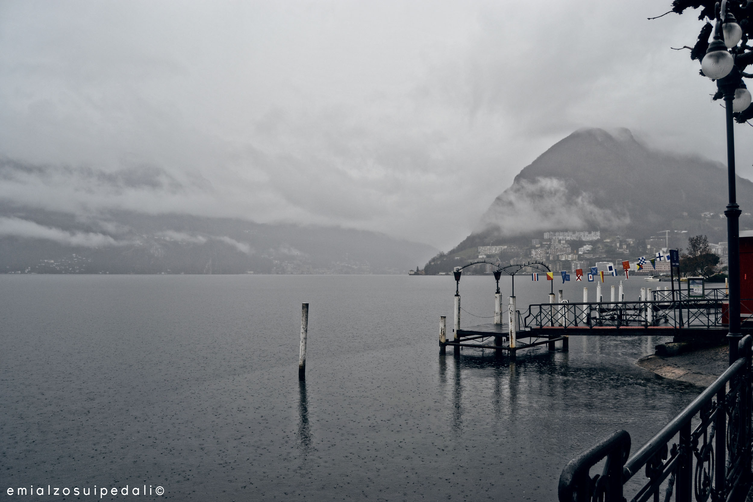 Lugano è grigia, zuppa di pioggia che tormenta le pozzanghere e la distesa d’acqua sbiadita come pietra grezza. Le montagne soffiano nuvole che sembrano i fumi di certi falò portati dal vento. Anche se queste sono bianche, come i cigni che passano, ogni tanto, come barche. E poi spariscono.