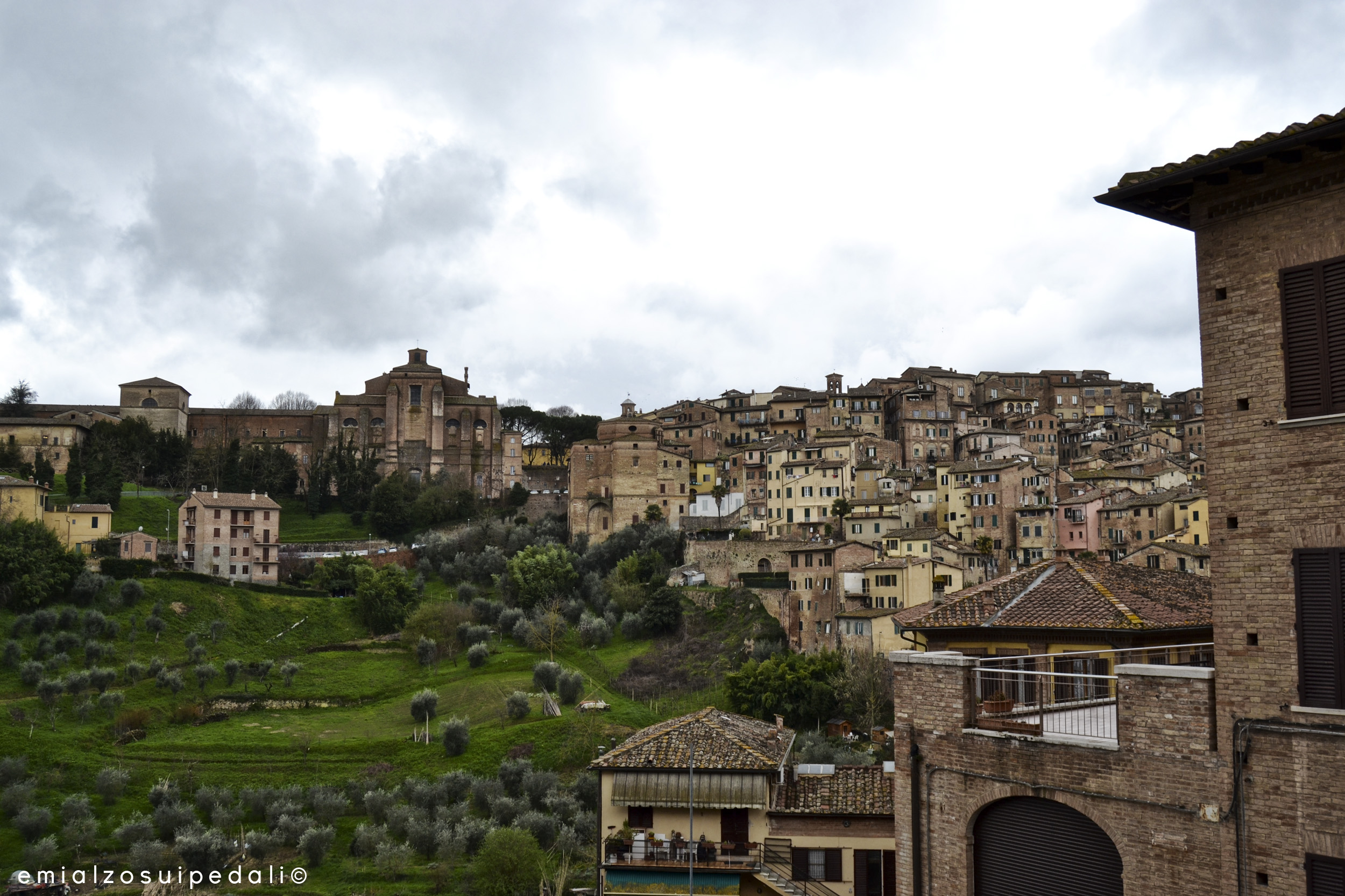 Siena è semideserta in questa mattina dove il vento fa volare tutto: le nuvole e le scatole di cartone vuote fuori dalle porte chiuse. A volte il vento porta pioggia, a volte se la porta via. Non so cos’ha di speciale questa città, sicuramente, come per le cose e le persone speciali, è difficile dirlo. Una signora chiusa nel piumino fino al collo lascia trotterellare il suo cane rasente il muro. Tra una casa e l’altra, ogni tanto, si apre un piccolo cortile, un vicolo, uno scorcio.