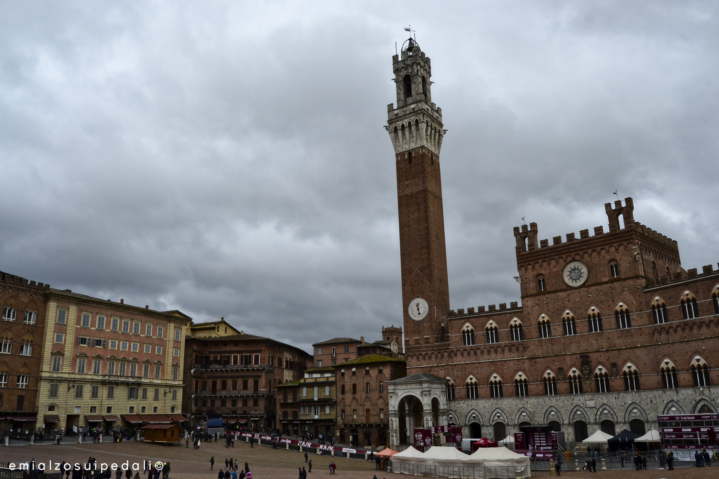Non riesco a capire la confusione di questa partenza, dei ciclisti che zigzagano tra le ammiraglie, la gente che sguscia tra di loro, i cani spaesati in mezzo a tutte quelle gambe e quelle ruote e che nessun padrone ha pensato di prendere in braccio. Loro partono, i tifosi sciamano, le bandiere sventolano sotto la pioggia che comincia a scendere. Sottile, senza troppa convinzione. Smette subito, esce uno strano sole fantasma che sparisce dietro i nuvoloni. Avevo lasciato Siena con il cielo azzurro, di un azzurro senza dubbi. La ritrovo più grigia ma con lo stesso vento. Che spazza tutto, che spezza il respiro. Ricomincia a piovere, smette e poi di nuovo quella luce strana che sa di sole.