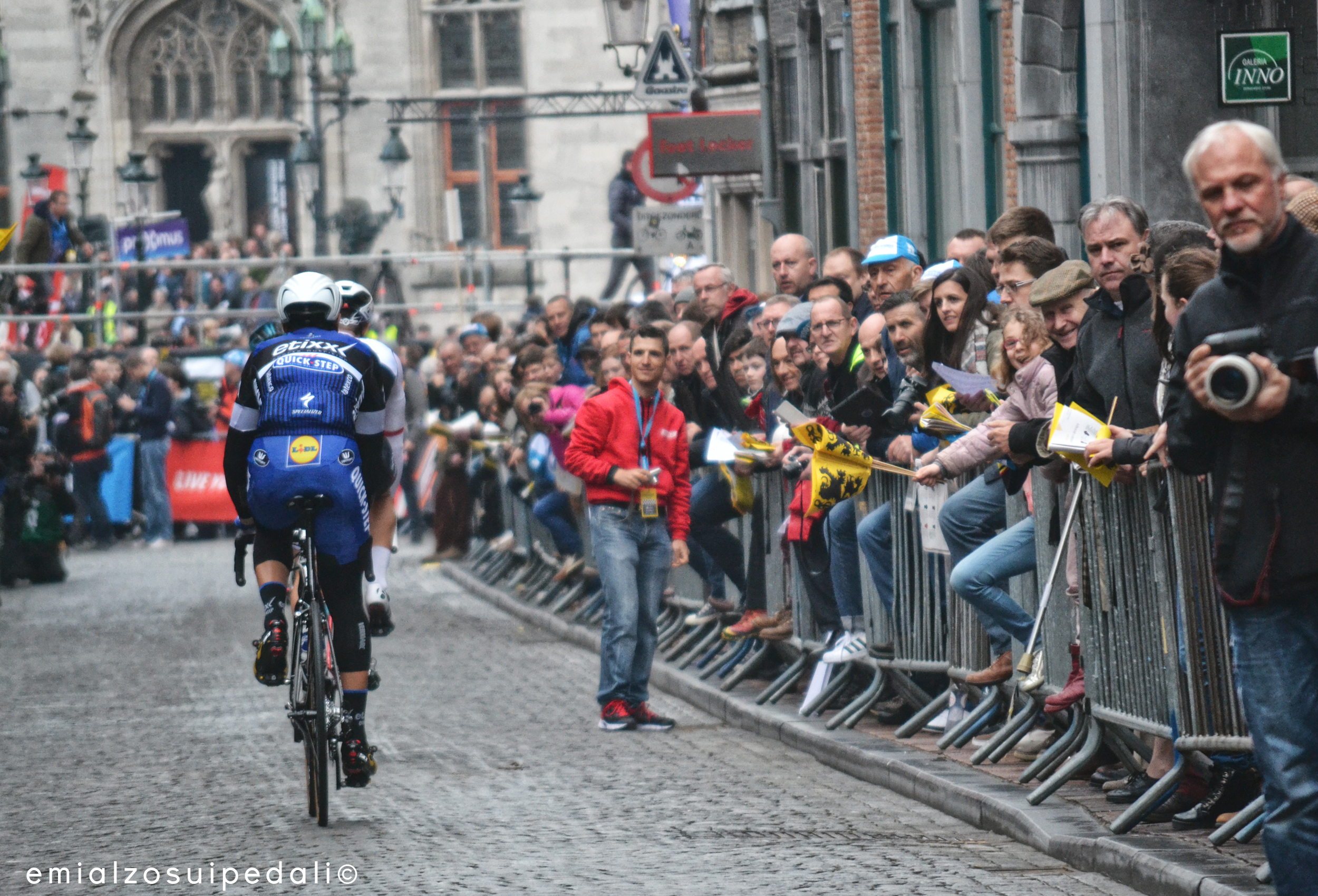 La piazza è già piena di gente, i ragazzi in maniche corte si portano sottobraccio i cartoni delle birre, qualcuno la tiene in mano già aperta, si sistema la visiera del cappello. Le bandiere gialle con il Leone delle Fiandre sbucano come girasoli, sempre di più, ad ogni occhiata di timido sole che fa brillare il pavè lucido e fa strizzare gli occhi ai bambini sulle spalle dei papà. E’ una festa che forse non si può spiegare a parole. Perché è un po’ come il sangue che ti scorre nelle vene. I Belgi amano il ciclismo e il ciclismo ama loro. Funziona come tutti gli amori speciali. Un fiume in piena. Le persone si fermano anche in autostrada per arrampicarsi sui guardrail dei ponti a vedere un passaggio e tutto quello che questo sport gli regala è un bene che torna. L’anima più ruvida appartiene a questo posto dove i muur e il pavé sono tutto. La città è un fiume in piena per davvero, un grande palco per rockstars, una passerella infinita di gente aggrappata alle transenne che urla in fiammingo prima di tutto e poi in tutte le altre lingue.