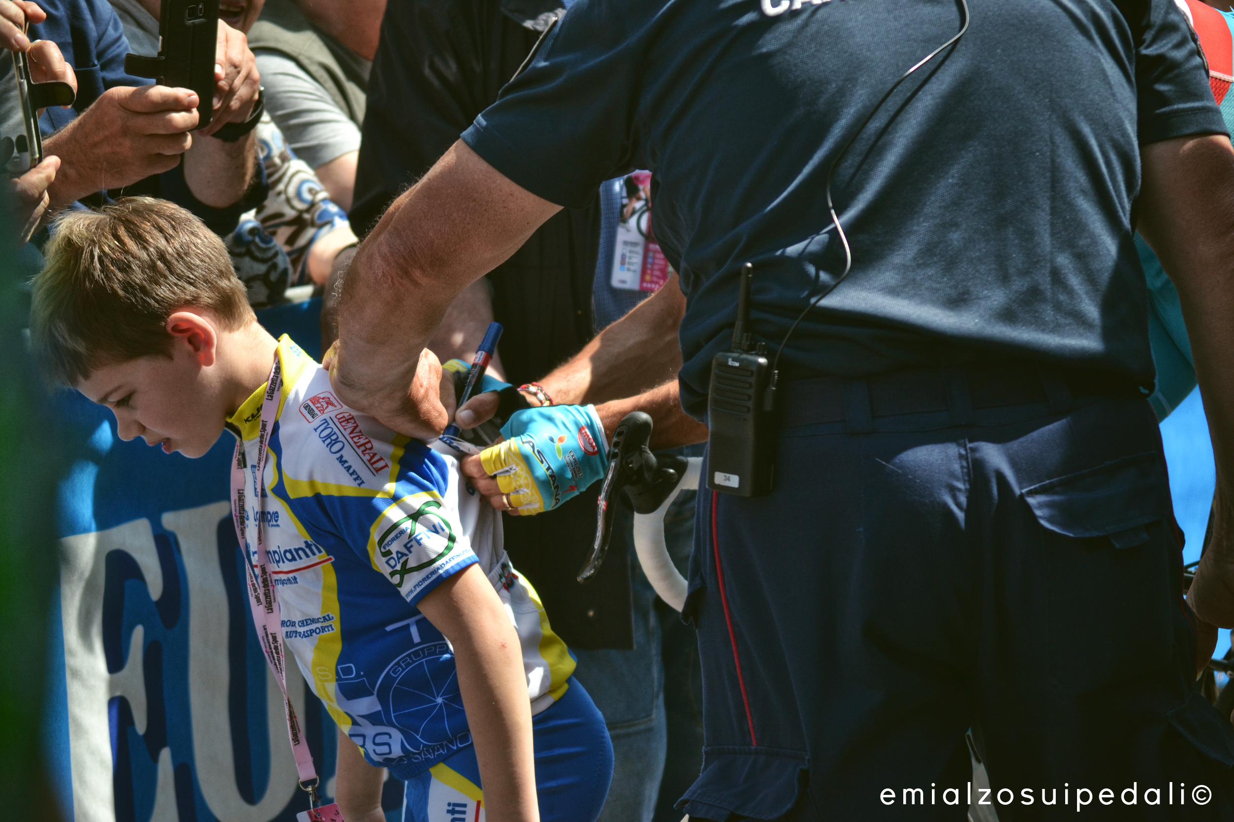 Sono le undici passate e c’è odore di fritto nell’aria. Una signora brontola. Cerca Nibali che si sta attardando alle firme. In dialetto dice che deve andare a casa a mangiare il risotto ma il Nibali lo vuole proprio vedere, non può andarsene senza dire poi di averlo visto. E quando Vincenzo arriva la gente si sporge, si allunga, tende le braccia, qualcuno vorrebbe solo stringergli una mano, toccarlo, dargli una pacca sulla spalla. Che le emozioni proprio non si dimenticano, quello che un ciclista regala sulla strada resta sempre e per sempre. Vincenzo sorride, non può accontentare tutti neanche volendo. Però ci prova sempre. C’è un bambino che gli chiede di autografargli la maglia della sua società che ha addosso. Un carabiniere lo aiuta e lui paziente aspetta che Nibali scriva il suo nome sulla stoffa. In silenzio, forse così emozionato da non riuscire a dire proprio nulla.