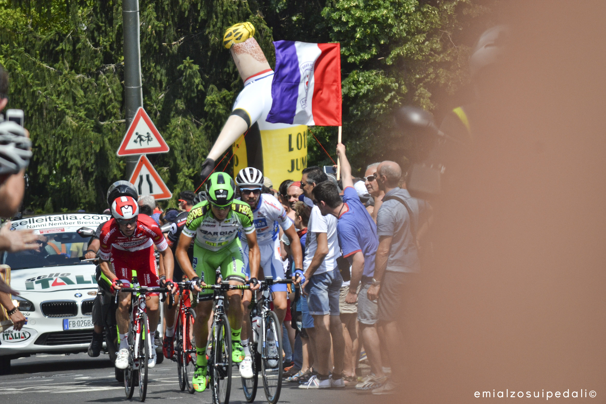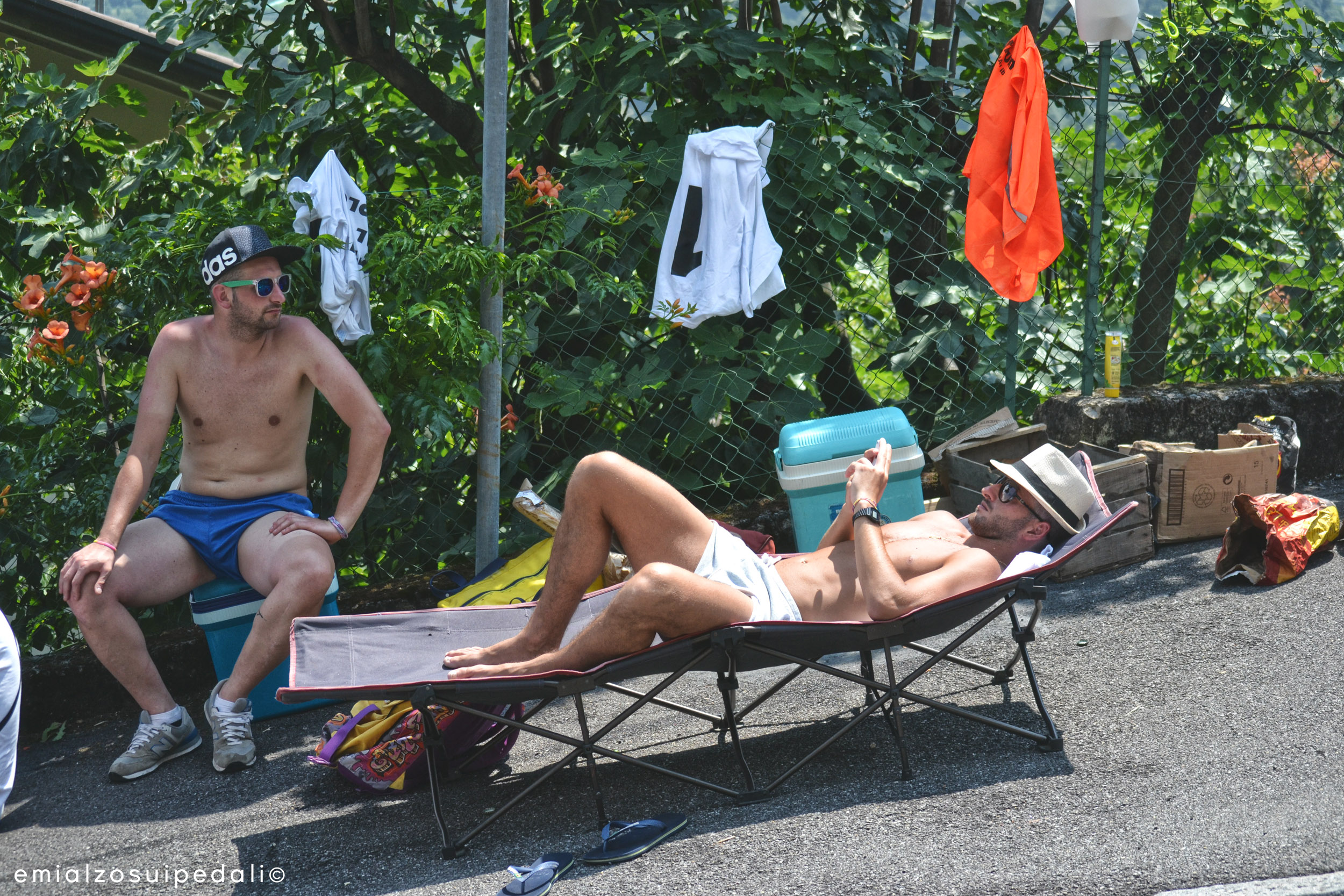 Qualche nuvola bianca come una spumiglia sbuca dalle montagne, il cielo è azzurro. Davano temporale, lo davano dalle undici e adesso qualcuno prega che non si avveri la previsione delle quindici. Meglio che non dico quello che avrebbe detto mio nonno, rigorosamente in dialetto come tutti i proverbi migliori. Intanto è mezzogiorno quasi spaccato e l’aria mitiga a tratti il sole torrido di fine giugno. Lo strappo di Erbanno va su secco e d’improvviso, è breve e spacca gambe. E’ una specie di pugnalata a tradimento dopo un falsopiano, giusto lo spazio di un parco giochi e un piccolo bar che da sulla valle, pieno di gente che chiede solo cose da bere. C’è odore di barbecue, il fumo delle griglie si mischia al caldo che sale dall’asfalto mentre qualcuno si rifugia sotto le poche chiazze d’ombra. I tifosi danno la caccia ai posti migliori dove appendere gli striscioni, qualcuno ha portato i gazebo, le sedie, i tavoli, le panche. Sono veri e propri presidi: a ognuno il suo, uniti dalla regola non scritta che poi, alla fine, si fa il tifo insieme e ci si scambia pure la vernice per scrivere sull’asfalto. Perché il ciclismo, diviso, non ha proprio senso di esistere.