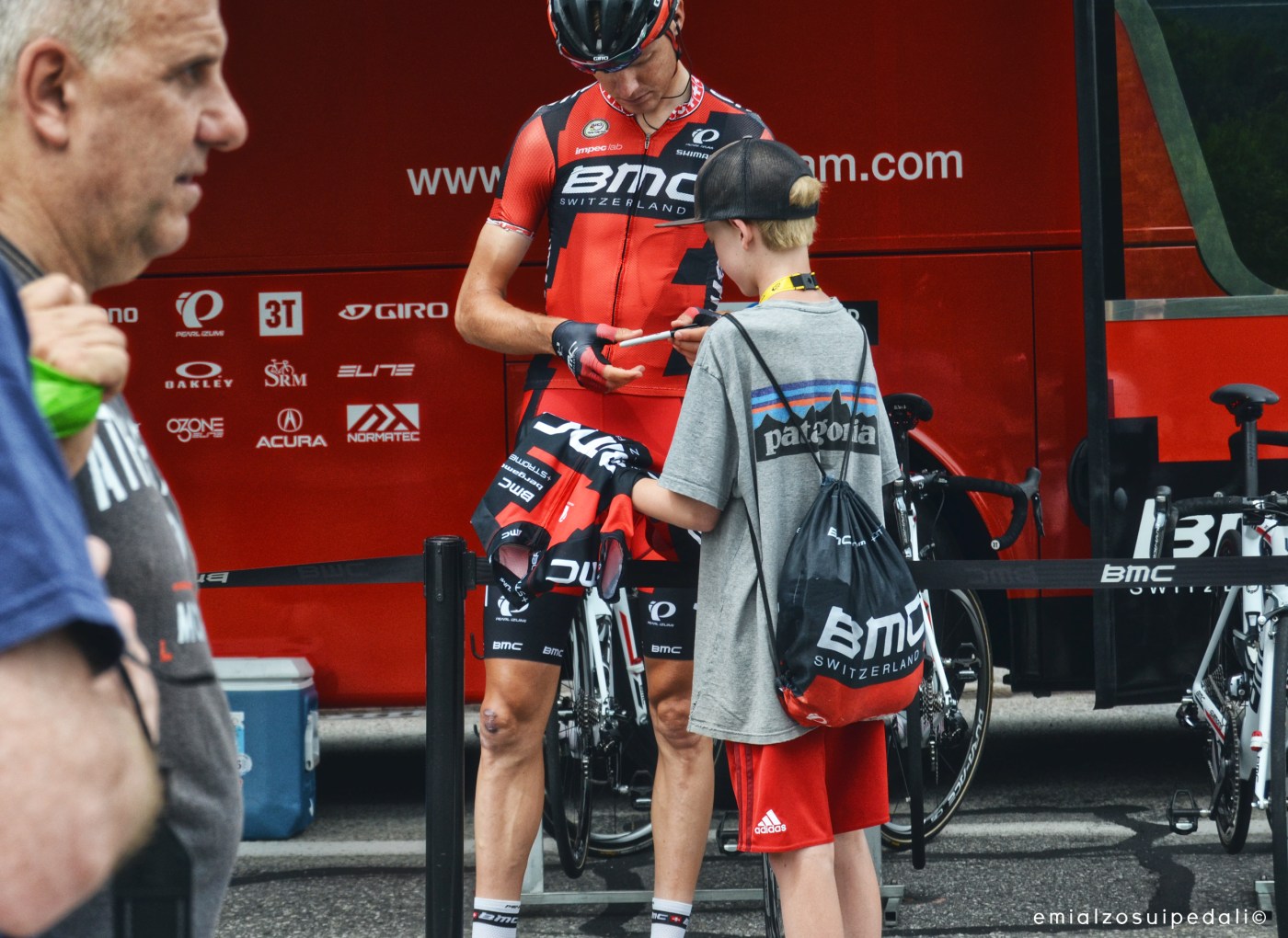 Le bandierine gialle, verdi e a pois sembrano certe file di lucine nelle feste di paese. La partenza. Ci voglio restare poco, giusto per salutare due o tre persone, respirare la solita aria lievemente caotica che si mischia al profumo delle baguette che esce dalle boulangerie. E invece niente. Alle dieci e mezza sono già consapevole che sarà impossibile. Non riesci ad andartene quando ancora i corridori sono qui, quando si fermano a fare le foto, a firmare gli autografi e fanno sorrisi sopra la tensione. Non ci riesci. Qualcuno fa i rulli nell’attesa.
