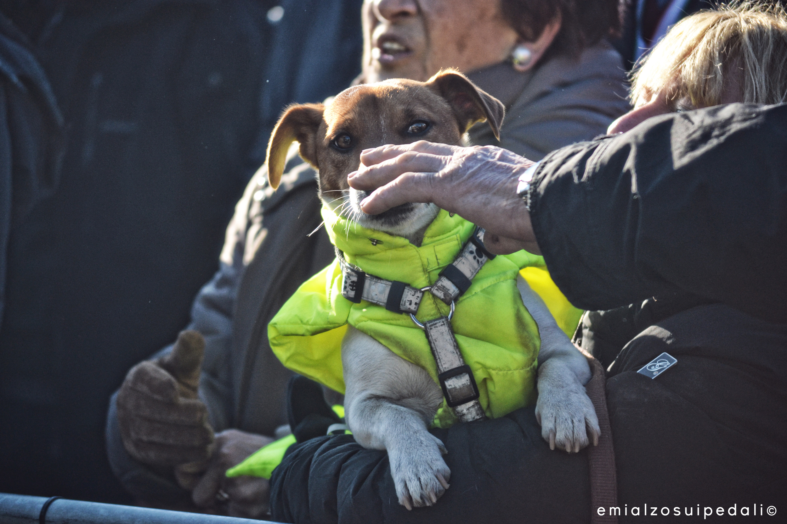 Il sole si fa appena più caldo, il ghiaccio nei rigagnoli si scioglie lentamente e nella foga qualcuno non se ne accorge. Per far prima a vedere il passaggio e risparmiare chissà che, un tizio corre e ci finisce dentro, pure la scarpa rimane incagliata nella poltiglia di acqua e fango. Con nonchalance se la ripesca e nonostante sia più imbevuta di un savoiardo dimenticato nel tè, la rimette e si affaccia alla transenna per incitare i primi. Il passaggio al volo, uno degli ultimi, e chissenefrega del piede che ora di sera avrà un principio di congelamento.