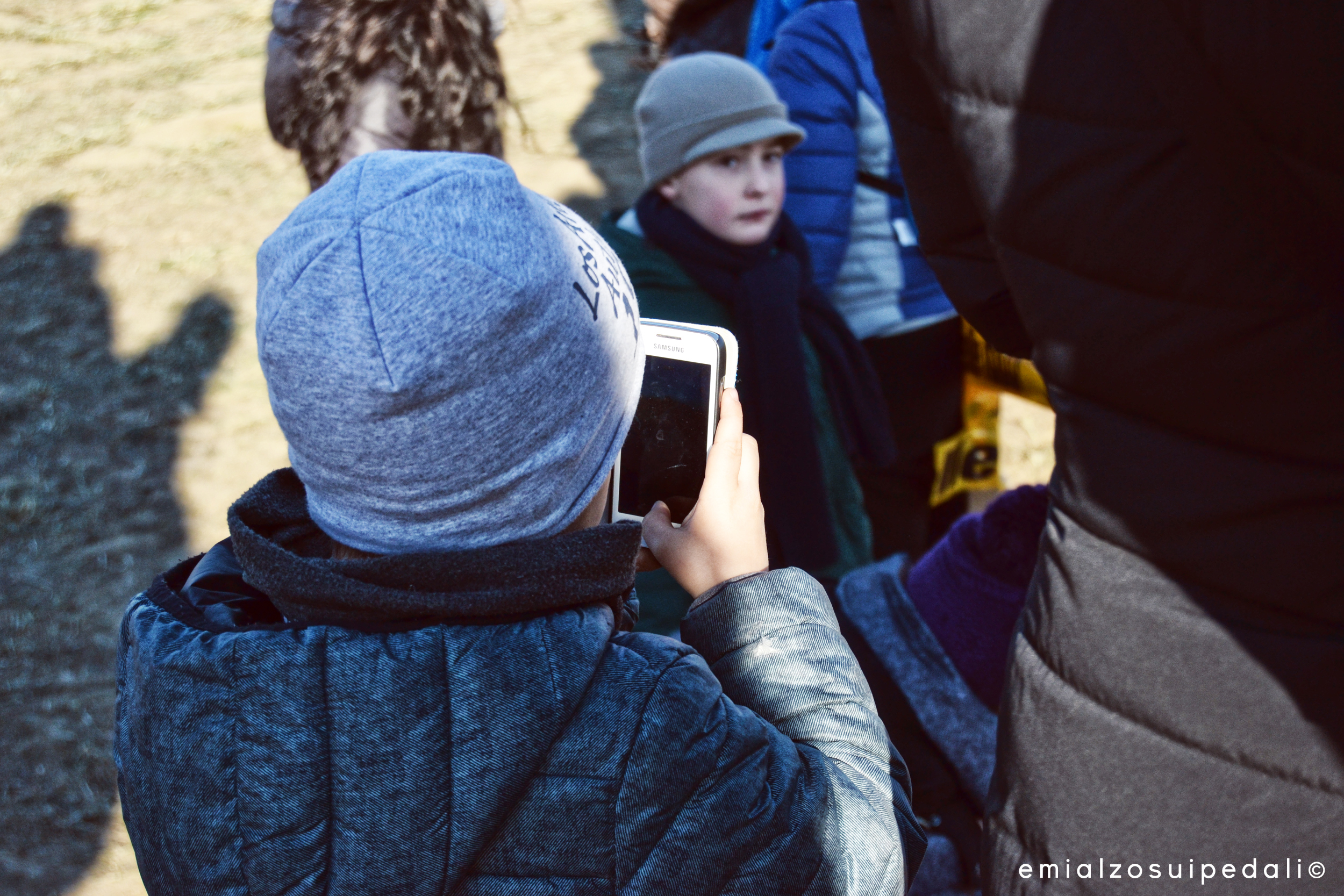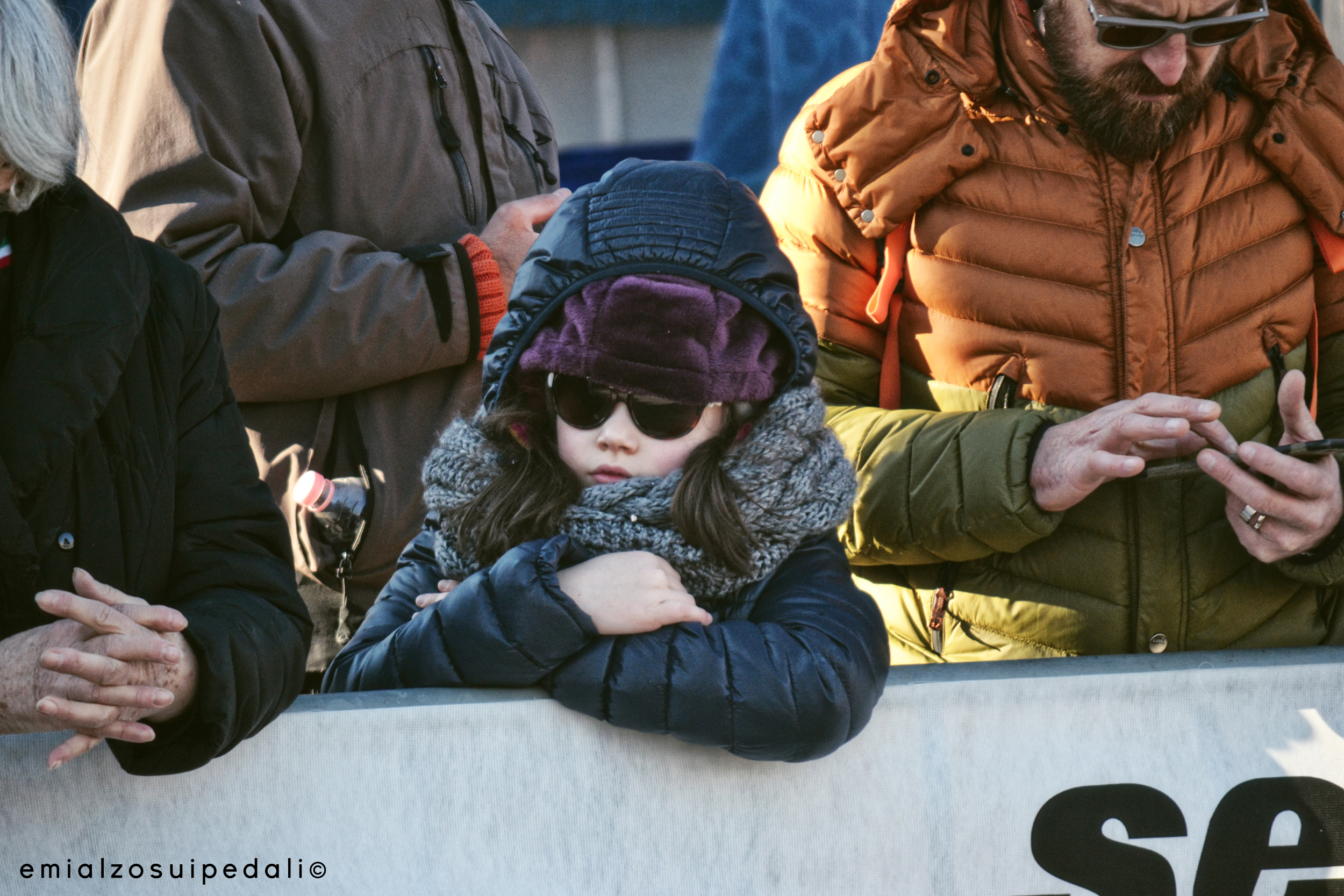 I bambini gironzolano senza briglie con i loro cappelli a filo degli occhi. Corrono da una curva all’altra, confabulano tra di loro. Non sentono il freddo, piuttosto sembrano piccoli animaletti che conoscono il loro territorio. Sono abituati persino a sapere cosa gridare, quando incitare, quando farlo più forte. Lo fanno con il loro solito modo, come se fossero adulti. Forse è questo il segreto:  lasciargli respirare il ciclismo come se fosse una cura prescritta, come lo iodio passeggiando accanto al mare d’inverno.