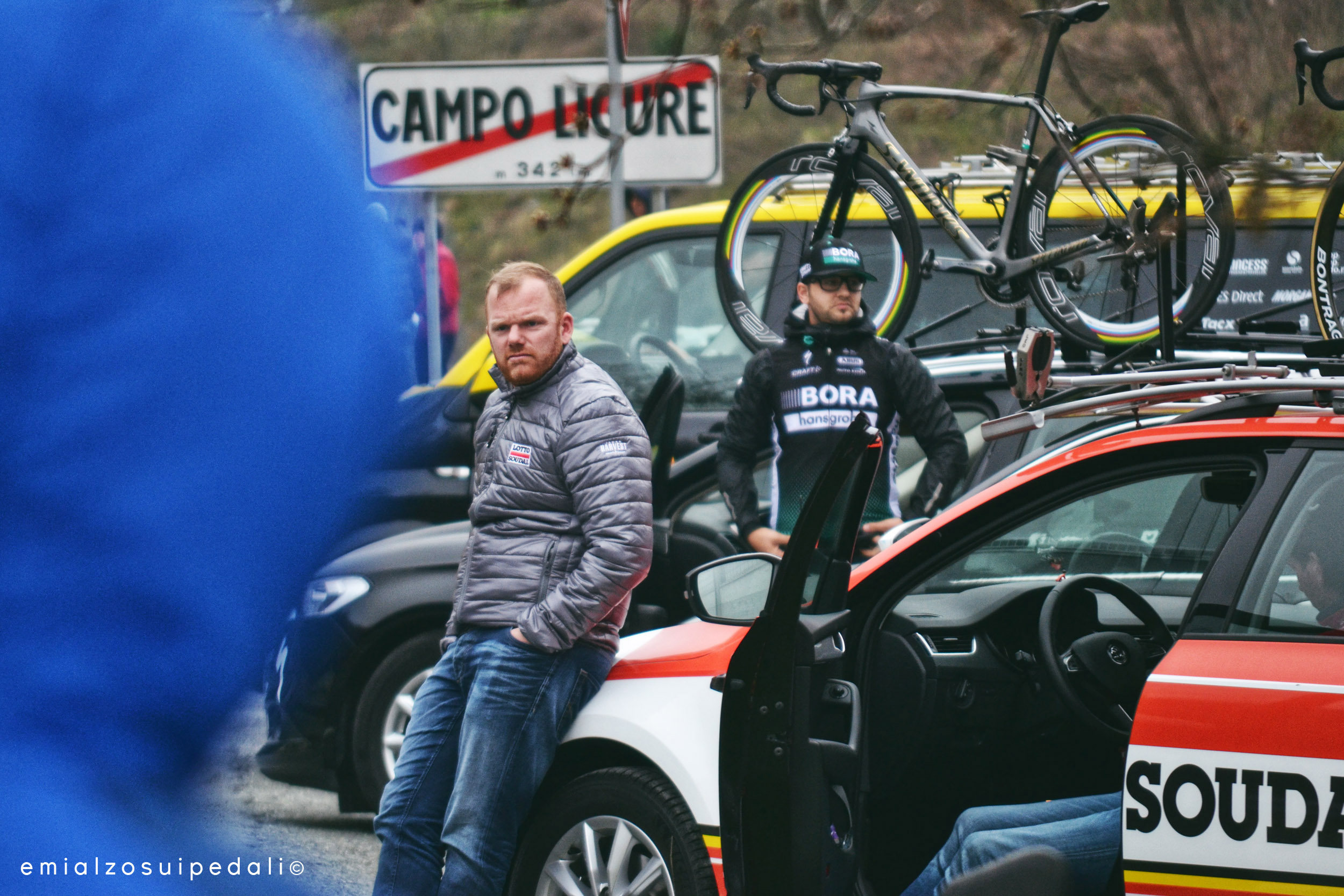 A Masone soffia un vento gelido che con la primavera non ha niente a che spartire. Un posto desolato ai piedi del Turchino, come un presepe senza neve e fuori stagione. E una piccola chiesa diroccata dove i ciclisti appoggiano le biciclette, tirano fuori le banane dalle tasche, si allacciano i kway fino al mento, fino agli occhi se potessero. La media della corsa è la più bassa della storia, dicono: colpa di sto vento che è arrivato oggi d’improvviso, dopo mille giornate di sole. Sciami di tre o quattro bambini imbacuccati nei loro piumini cercano le borracce, aspettano il passaggio per vederle volare, si butterebbero nei fossi per portarne a casa una; i massaggiatori preparano i sacchetti pieni a bordo strada, qualcuno tiene da parte i bicchierini di te e di caffè bollente. Arriva la fuga, passa il gruppo, viene fagocitato tutto in pochi secondi, una folata di vento nel vento stesso.