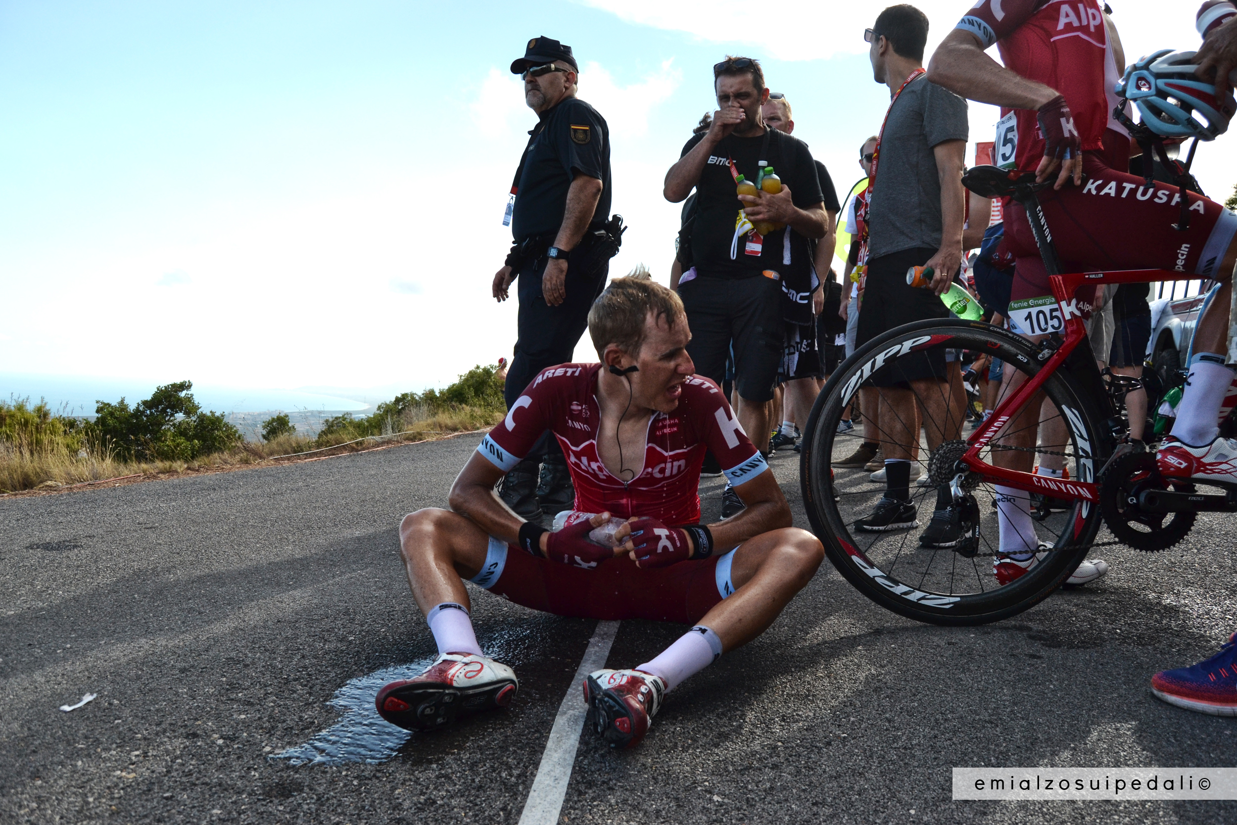 Sei minuti che se li mangiano in un soffio, le rampe sono dure qui, brevi e secche e intense, come questo posto, come l’arsura di fine agosto. Una manciata di cubetti di ghiaccio si scioglie lentamente sull’asfalto, vengono dai frigo dei massaggiatori. Un bambino si avvicina, ne prende due e li butta nella sua borraccia.