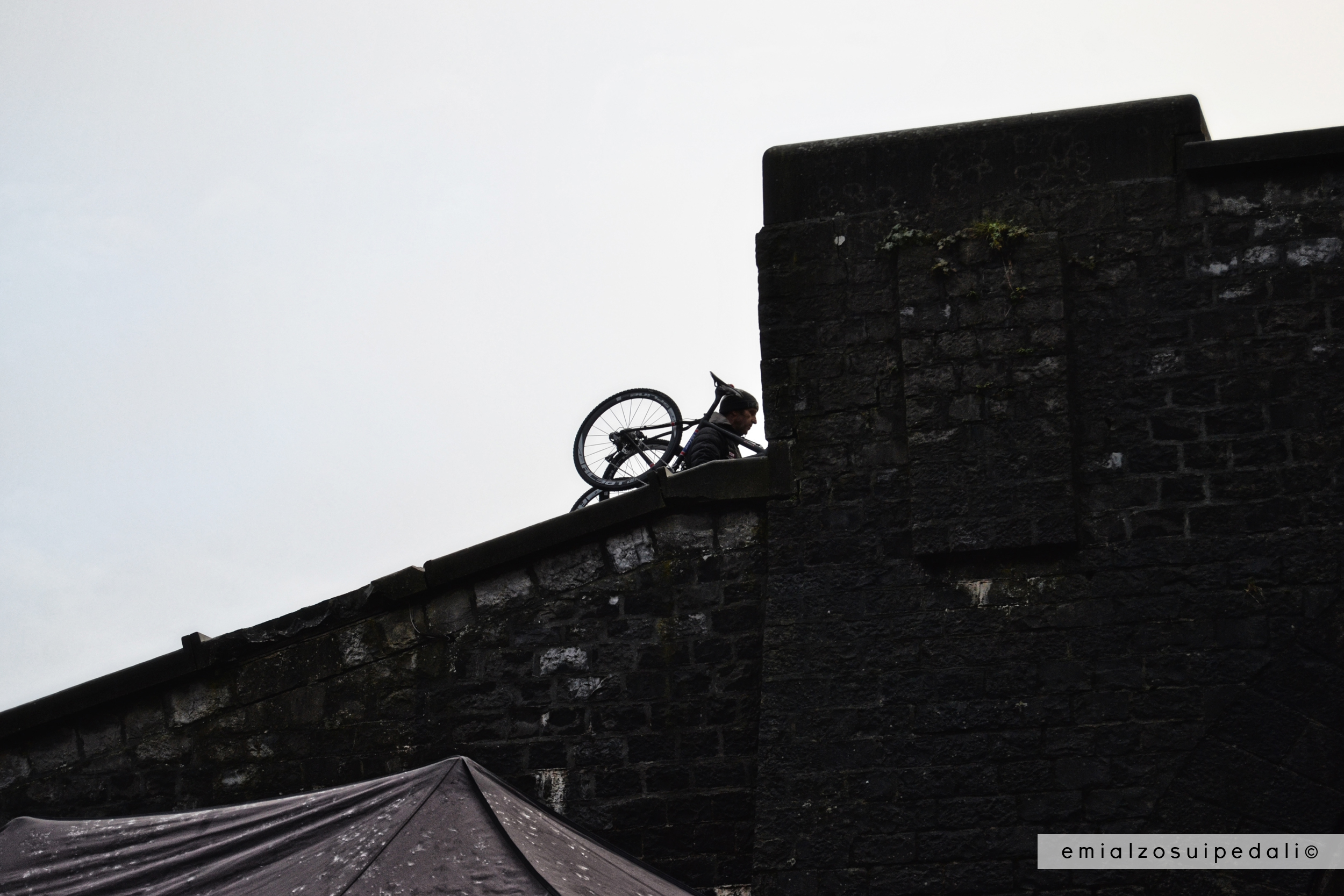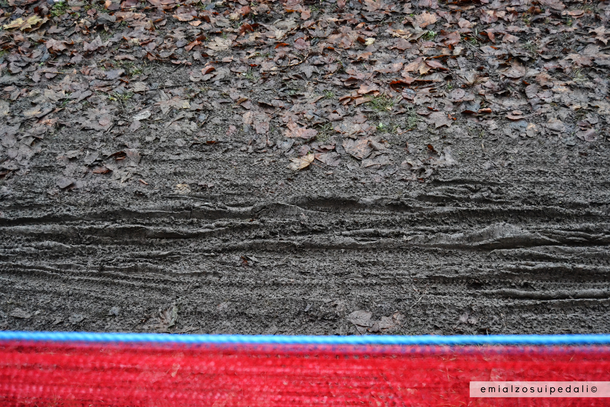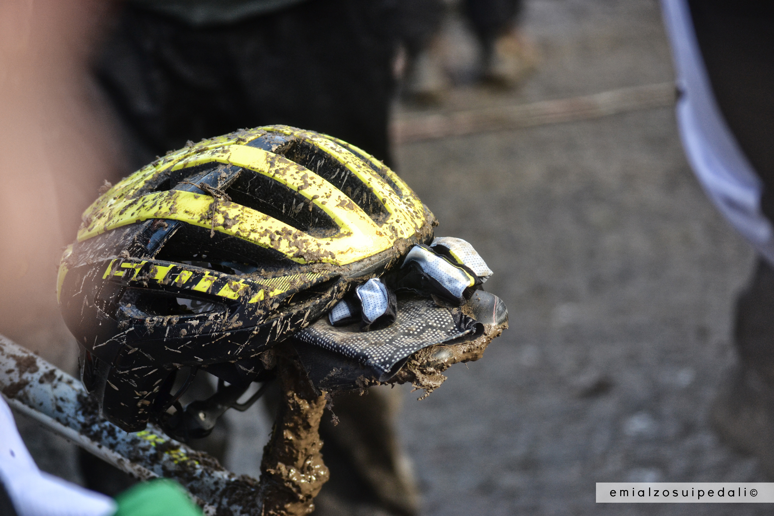 La gente arriva a manciate, un timbro sul braccio come nelle discoteche, in fondo qui è lo sballo del sabato sera secondo il ciclismo, corrono qua e là in equilibrio per tenere i bicchieri di birra in mano diritti e non scivolare, qualcuno cade, si lava con il fango, con la birra. Ridono, sbronzi marci. Tartarughe ninja risalgono il crinale con l’aiuto delle corde come in una missione segreta, la banda con gli strumenti musicali a quadretti colorati sguscia tra le persone in coda per i ticket del pranzo, signori con improbabili cappellini con una ruota a metà piena di lucine si affrettano agli attraversamenti continuamente intasati da chi  vuol vedere tutto, nessun passaggio può essere sprecato.