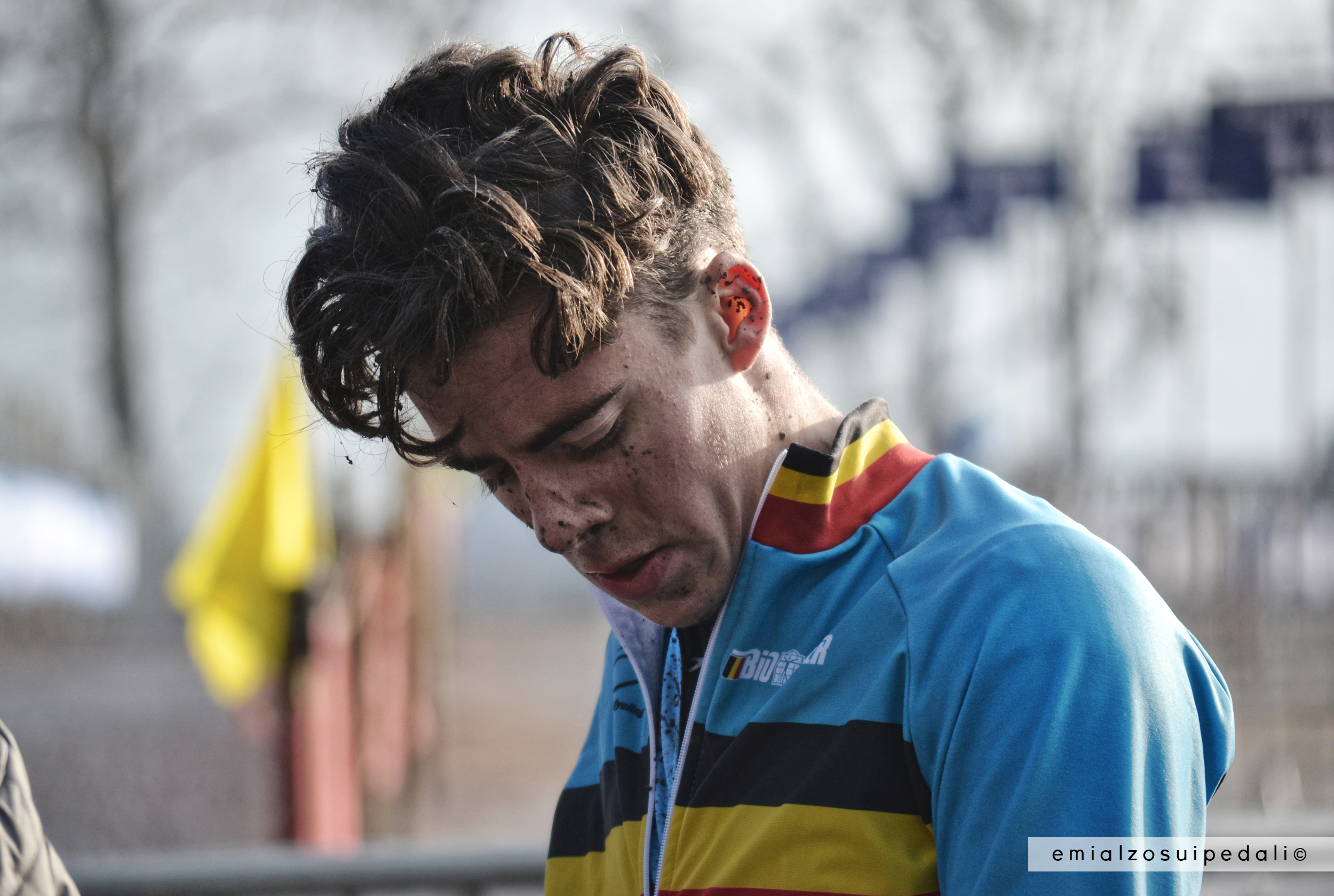 E’ bianca la divisa con l’arcobaleno, gli occhiali di Wout Van Aert riflettono tutta Namur, la luce che si fa grigia verso sera, il circuito che è una lingua ancora più scura, viscida, una dichiarazione sfrontata e violenta, di quelle che le senti come un volo nello stomaco, le montagne russe di un istante che ne vale altri cento. La prima volta che Mathieu si può battere in questa stagione. Le cose vanno così, un giorno si può essere più vulnerabili, un altro più forti. Si può volare come missili in certi pomeriggi, non sentire niente a parte la gente che ti incita, sei il primo o sei l’ultimo, è così per tutti. Eroi sempre, eroi per sempre.