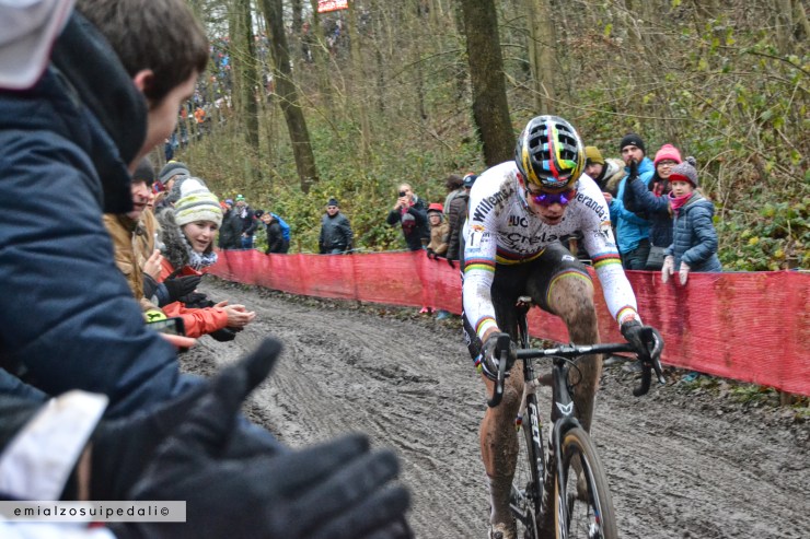 L’aria fredda viene dal Nord, la valle è ancora più ombrosa, gli alberi più neri, la gente scatenata per l’ultimo giro di una corsa pazza. Wout incita il pubblico prima dell’ultima schiena di fango da affrontare con la bici in spalla, una mano a reggere il telaio, l’altra a dare il cinque a tutti, come le star, come chi sa quanto conta quel rapporto con il pubblico, quanto conta sentire le urla che ti dicono di andare avanti quando sei allo stremo o quando stai per vincere. Senti tutto o senti niente in bici, è una strana condizione di equilibrio che passa attraverso il dolore. E fino in fondo non lo puoi spiegare.