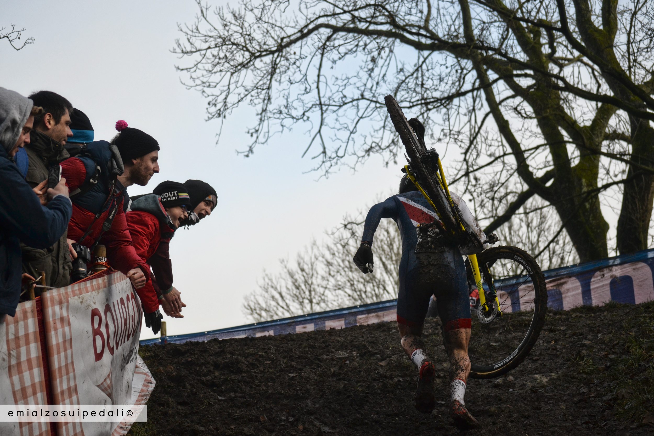 E’ da ieri che sento prudere il tatuaggio, è l’ortica del Kwaremont, il morso di questa terra e io a queste cose ci credo, credo più a quello che sento che a quello che vedo. La realtà è soprannaturale. Namur anche. Con l’odore di corteccia umida, di muschi, delle ultime foglie morte che il terreno divorerà ancora, l’odore delle patatine fritte, delle griglie, delle salse, di birra e di vino caldo. Scivola tutto in gola assieme al freddo che pietrifica gli occhi, il sapore delle domeniche del Belgio in famiglia, i bambini che corrono avanti e indietro, urlano Op, Op, Op, Alé e si infangano, si arrampicano.