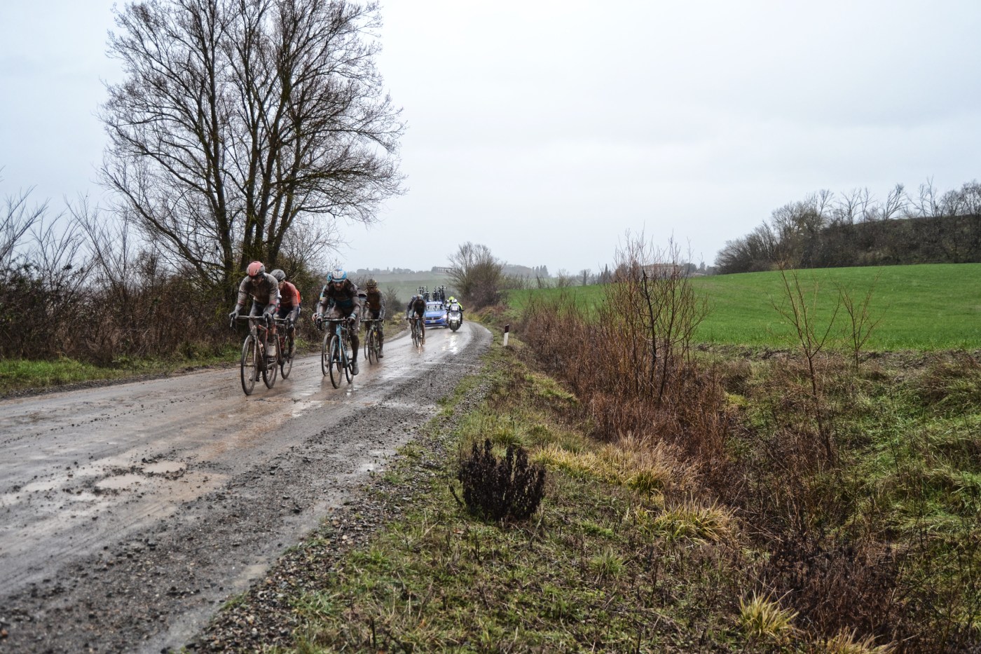 Le strade bianche sono lingue di fanghiglia che girano attorno ai borghi, niente polvere e nessuno sa dire se sia meglio o peggio, son bastarde comunque ed è la loro bellezza. Una maledizione, come troppo spesso succede nel ciclismo. Le ammiraglie passano, sollevano le pozzanghere fino ai paraurti, un breve tsunami e poi di nuovo quiete. Non c’è nessuno, nemmeno il passaggio riesce a rompere il silenzio monacale delle colline, è un inferno dentro forse, non fuori di certo; come tutte le volte in cui crediamo di decifrare qualcosa e invece sbagliamo. Sono già tutti neri di fango e questo è solo il tratto numero quattro: i fuggitivi, ombre contro i fari in lontananza e poi gli altri, a gruppetti o ultimi. Quanto devono sembrare immense queste colline ad affrontarle da soli, inseguiti dalla tentazione di arrendersi che tanto, alla fine, tra i primi ci arrivi solo nei sogni.