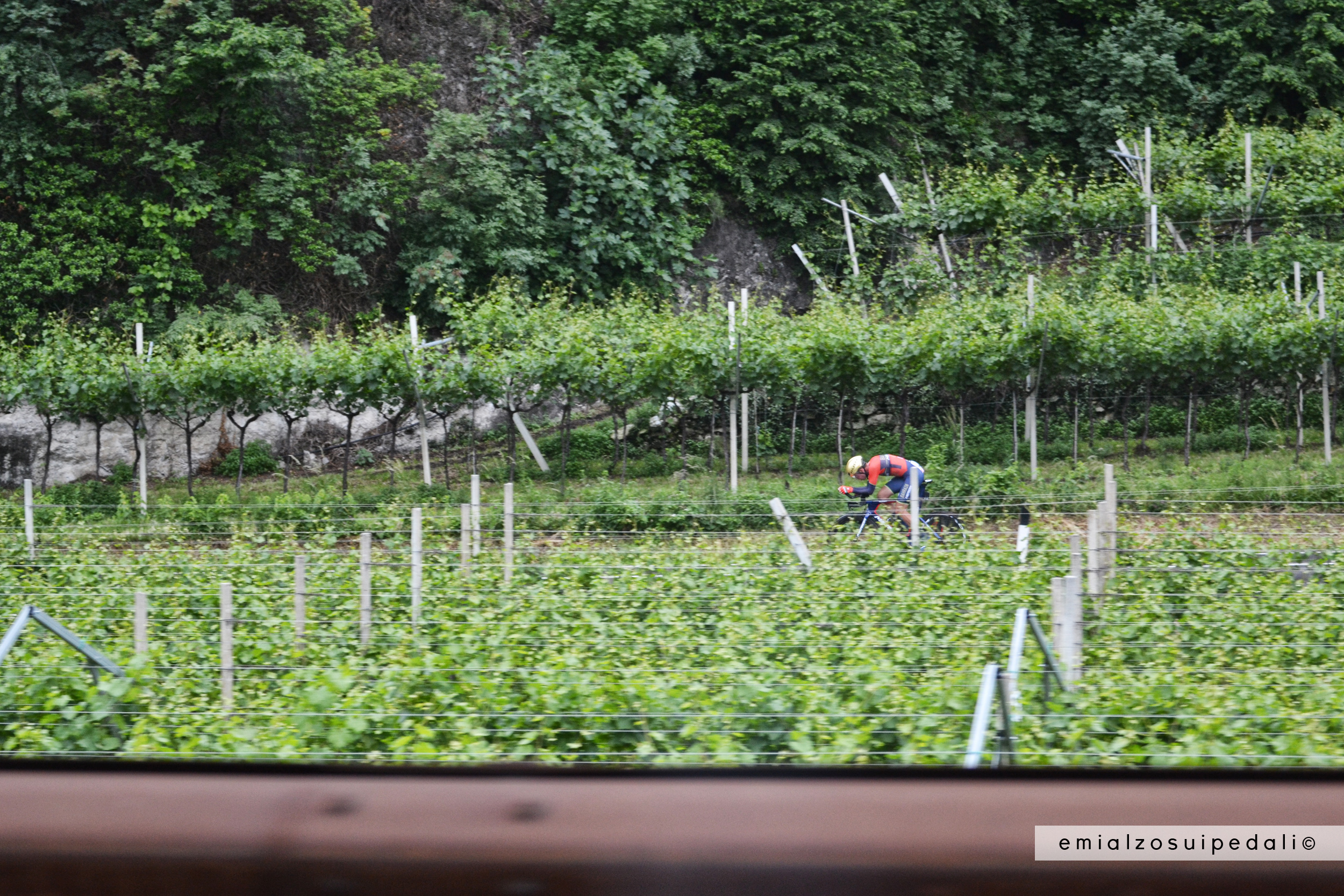 Abbiamo fatto il giro del mondo solo per non andare contro la corsa che sta sull’altra provinciale più a valle. Trento-Rovereto. Una marea di viti, un cielo mai quieto, le ciliegie acerbe, l’odore del gelsomino da qualche parte. Sette chilometri più in là dell’arrivo, tra un paese e l’altro, con una manciata di gente che aspetta il giro con l’ordine dei partenti scritto a mano, le case aperte, i bambini che saltano, i vecchi che bevono vino sui tavolini pieghevoli tirati giù dai camper e il tempo scandito dalle sirene in lontananza che annunciano l’arrivo, le ruote lenticolari sorde sull’asfalto. La cronometro è sempre un gioco di pieni e vuoti.