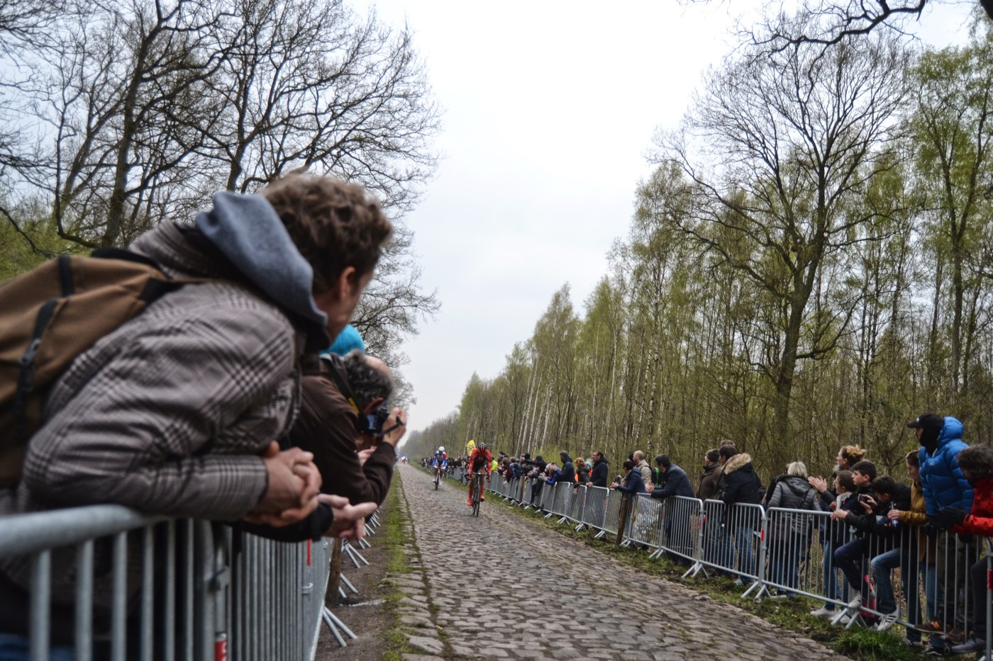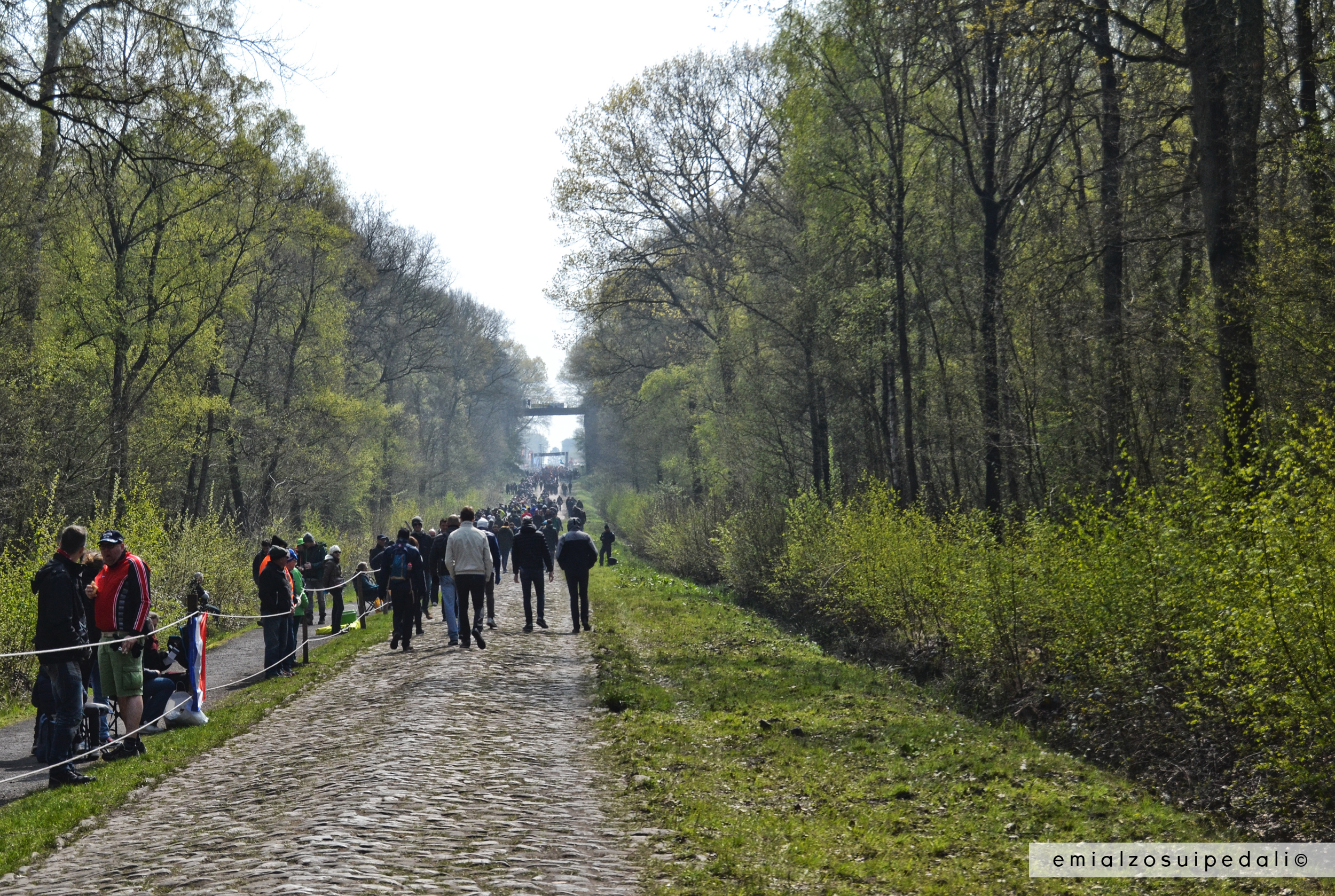 La gente mangia per terra come un pic-nic tra i boschi, impassibile, con il freddo che ti taglia le ossa, come se fosse un gelido inverno. C’è Elsa di Frozen con la barba e uno che grida: “Lampaert” per tutta la foresta, come una sentinella: potrei giurare che lo sentono fino a là in fondo, fino all’entrata dove c’è il passaggio a livello e una festa con fiumi di birra sotto il cartello che indica cinque stelle. La difficoltà del settore, come se non lo sapessero, uno dei peggiori, proprio all’inizio dove la prendi a mille all’ora e i sassi sono i più taglienti di tutti, sporgono come denti, come maledetti denti d’acciaio. Ma così diceva Hinault: devi andare veloce, devi far finta di volare per cercare di non sentire il dolore. Lui la odiava questa corsa, lui l’ha vinta.