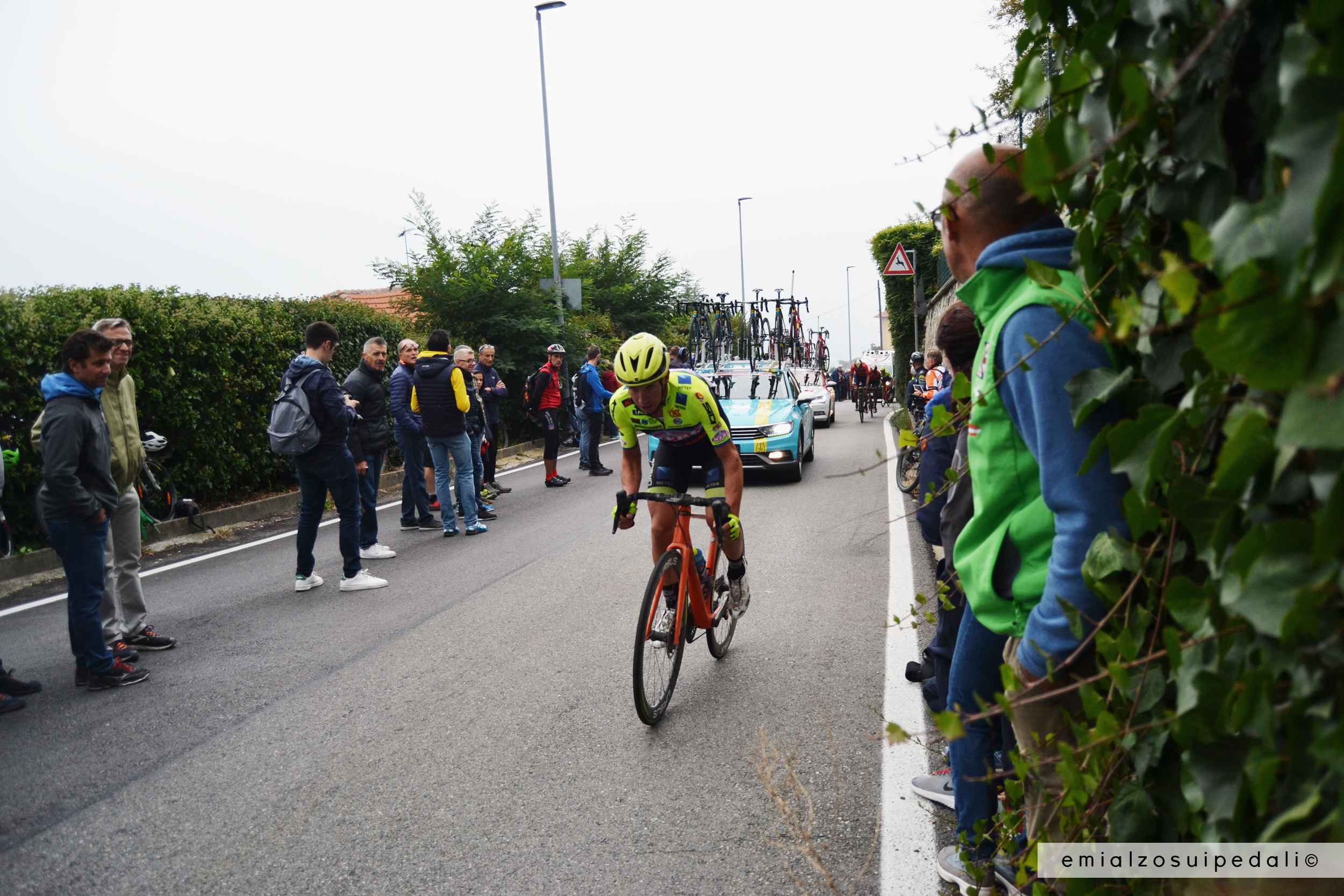 Sento l’odore del bosco sopra le schiene piegate degli ultimi, non pensano più alla vittoria, sentono solo il mal di gambe, sentono il sudore freddo colare sulla faccia, l’umido del pomeriggio. Ma niente si vede da fuori, il silenzio dell’ascesa è paragonabile a quello di una chiesa: mille preghiere o forse milioni di imprecazioni ma per il resto niente, nessun rumore placa il profondo baratro di una curva al dieci per cento.
