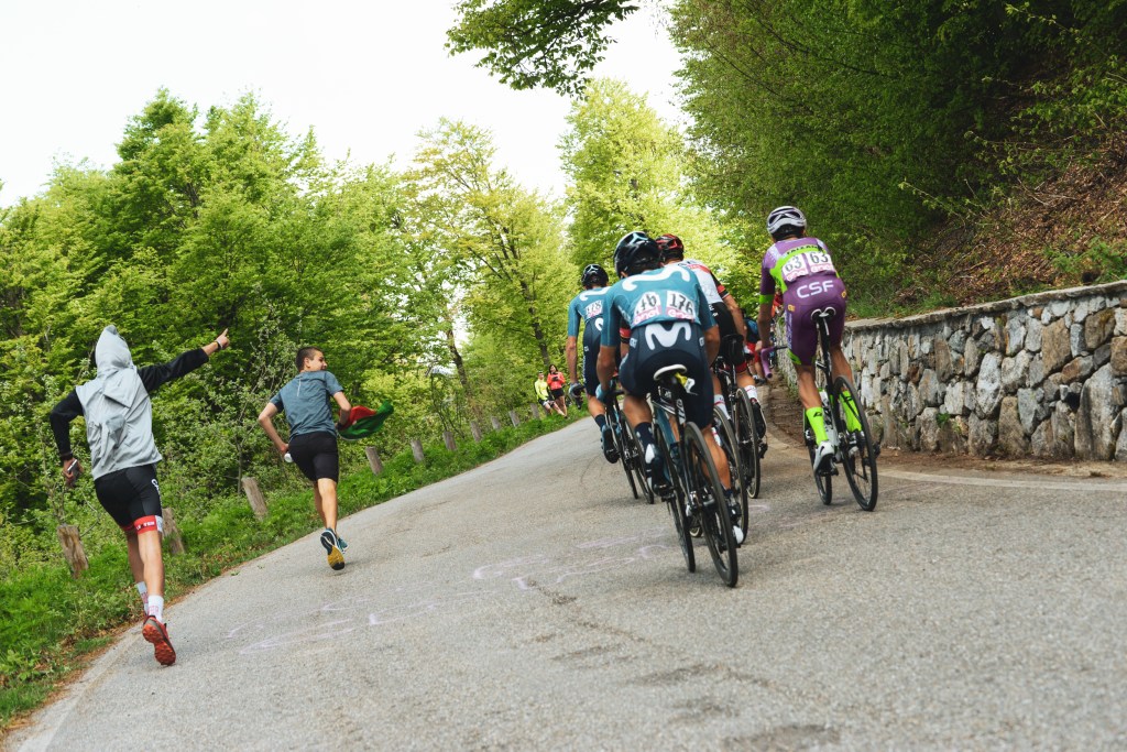 Sento i rivoli di sudore lungo la schiena per le due felpe e l’antivento che mi sono messa in una giornata in cui la gente per la strada sta a petto nudo. Due tipi – uno vestito da squalo che probabilmente sta facendo anche lui una sauna gratis – incitano Formolo, si parlano, gli dicono che lo aspettano domani. “A domani” è nella lista delle parole che accorciano le distanze, a volte le diciamo con distrazione, altre volte invece sanciscono un legame.