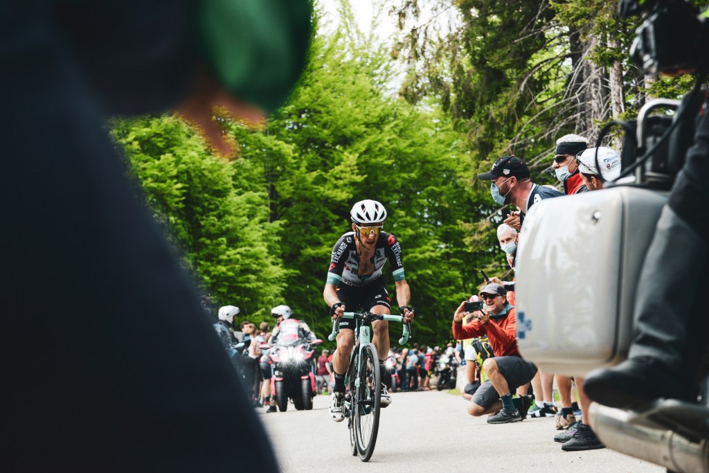 Le montagne occhieggiano appena tra gli alberi, queste non sono salite spettacolari, sono raccolte come una via crucis, non hai il tempo di vedere quello che c’è attorno, pensi solo a come prevalere sul tuo dolore. Yates sbuca dalla curva, sta cercando di ribaltare tutto e il ciclismo lo illude, perché è così che fa, ogni dannatissima volta. Ti illude che la forma della realtà non è questa, che la strada ha le sue leggi, come il destino.