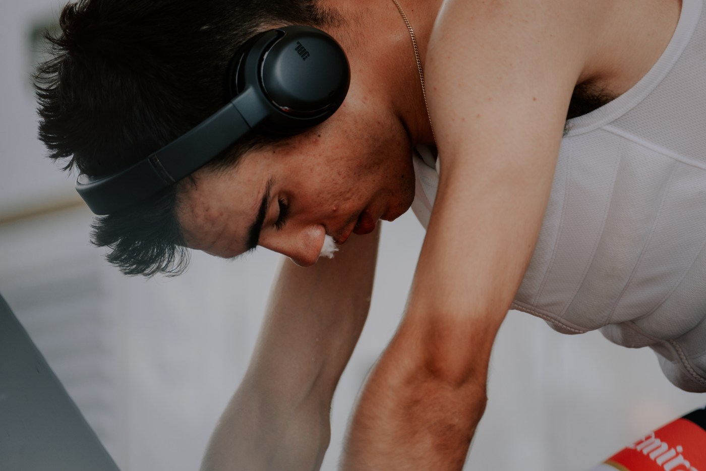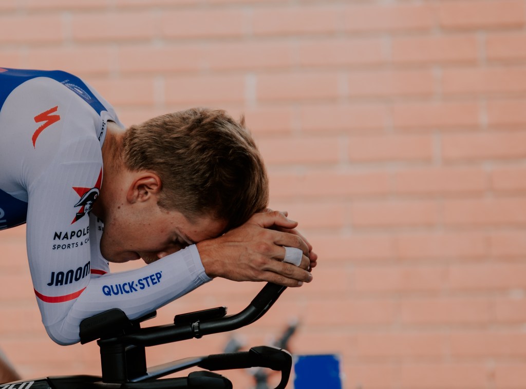 Sarà dal 2013 che non fotografo ciclisti sui rulli. Le palme svettano nel cielo azzurro e l’aria umida sfida i grandi ventilatori davanti alle biciclette immobili. Sono sempre stata una fissata delle emozioni ad alte frequenze, tutto intenso fino al cervello e forse è per questo che amo vederli così, con la fronte sulle mani come in preghiera e gli occhi chiusi come quando raggiungi l’orgasmo. Il sudore gocciola sul telaio. Tieni il controllo sulla potenza. Respira.