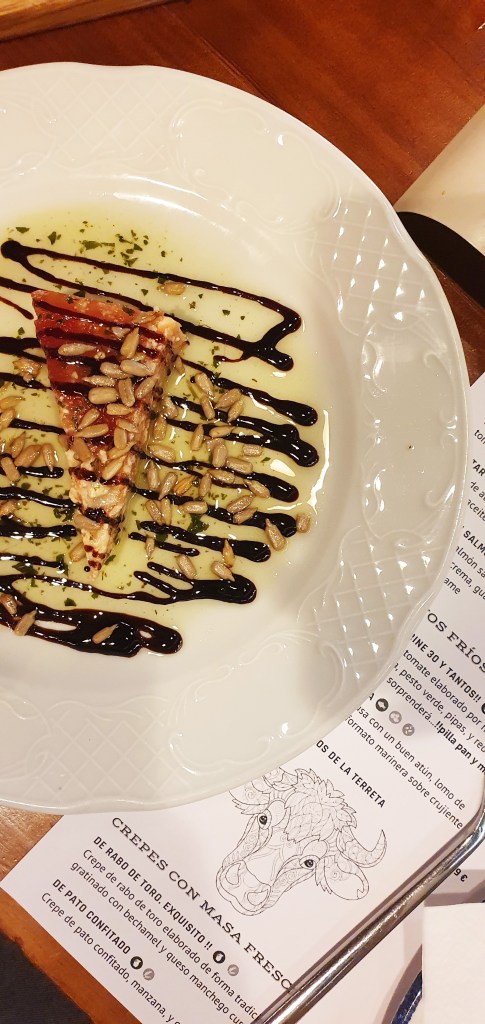 Finalmente raggiungiamo il locale della cena dove suonano il flamenco dal vivo. La tipa ci offre un privé gratis, ovvero una stanza con bagno privato al secondo piano che si affaccia sul cortile interno. Arrivano Fran, José e anche Nacho stavolta, con il quale ho un accordo segreto sull’ordinazione dei Flamenquines – ho già spiegato di questi, qui. Ma passa ancora mezz’ora e altri tre calici di vino prima di mettere qualcosa sotto i denti. Oramai credo di non avere più fame quando arrivano le tapas, compreso un tataki di tonno e – udite udite – l’alga Wakame. C’è il tartufo, il salmorejo e chissà cos’altro. Tutti i sapori si mescolano come succede spesso qui e non sai più distinguere niente. Alla fine pare che si debba sempre mangiare fino a scoppiare ma continuo ad andare a dormire sognando la colazione.