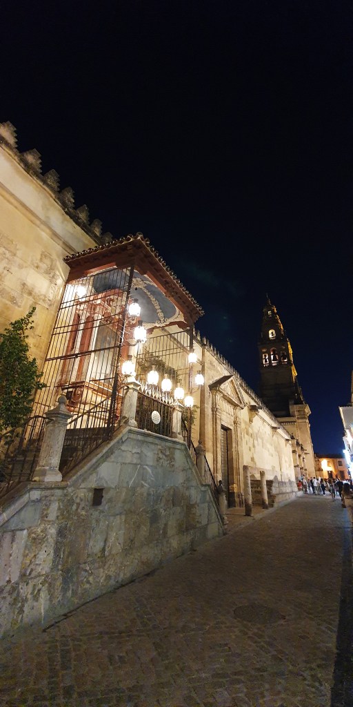 Le ragazze prendono una birra ma io – da oramai non so quando – non riesco a mandarne giù neanche un sorso. Prendo un calice di vino bianco e poi andiamo a fare le foto alla Calleja de Las Flores, un minuscolo vicolo che è stato addirittura dichiarato patrimonio dell’umanità dall’Unesco. La vera magia però è alla fine: una volta percorsa la breve stradina, basta girarsi per rimanere incantati dallo scorcio unico sulla torre della Moschea e – questa sera in particolare – anche della luna andalusa che guarda le sue case bianche di gesso come farebbe in un quadro.