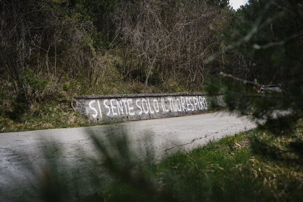 Sulle montagne ci si aspetta il silenzio. Sul Carpegna – che sia gennaio o agosto – c’è un costante vento che soffia tra i pini, come una musica, un canto, qualcuno che sussurra cose indecifrabili. Si sente solo il tuo respiro, c’è scritto su una curva. E sfido chiunque a non sentire l’intensità di quelle parole dipinte con la vernice, come fanno gli innamorati disperati quando scrivono “mi manchi” sui muri, sperando che le cose cambino, che dall’altra parte qualcuno ascolti, che dall’altra parte qualcuno ritorni.