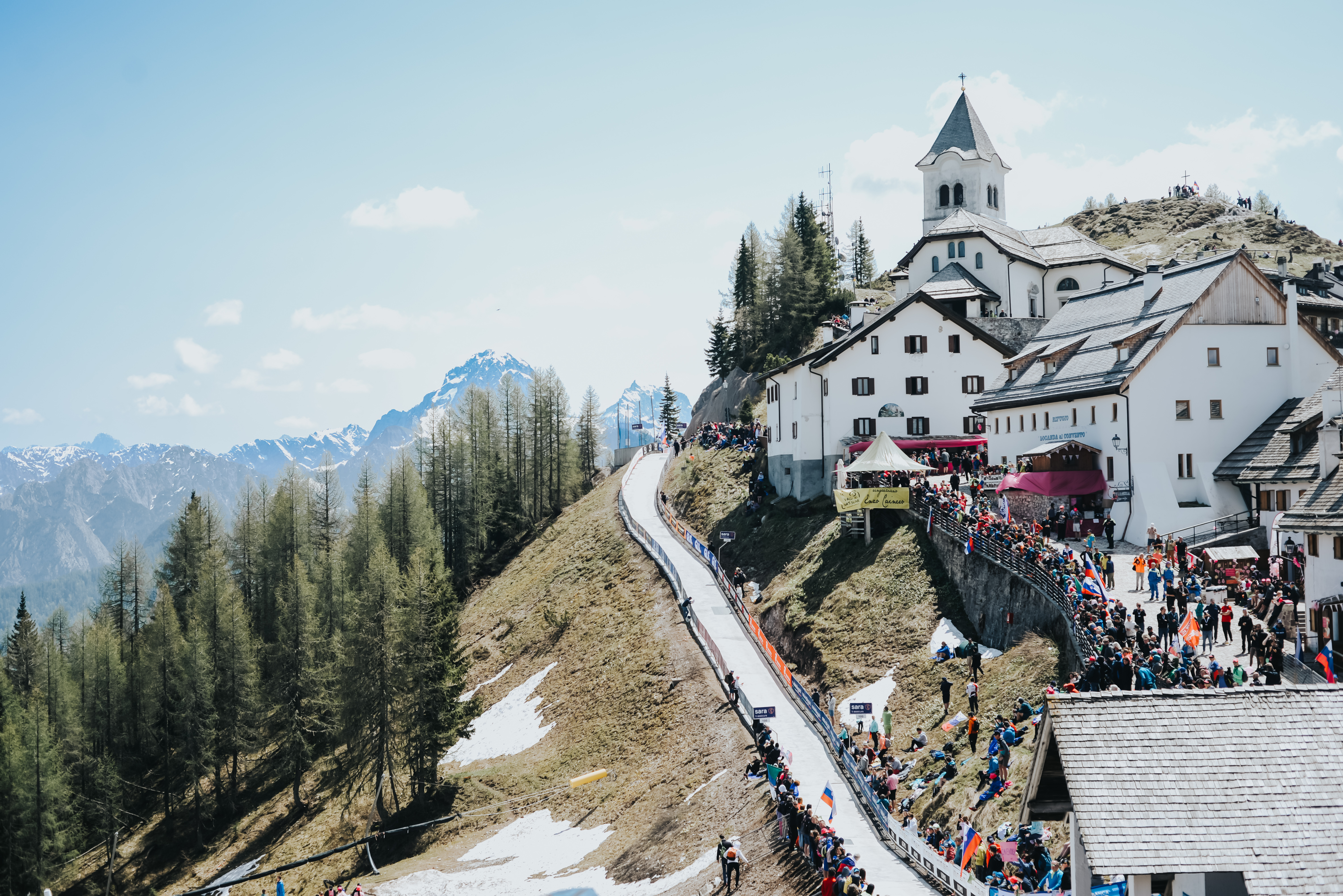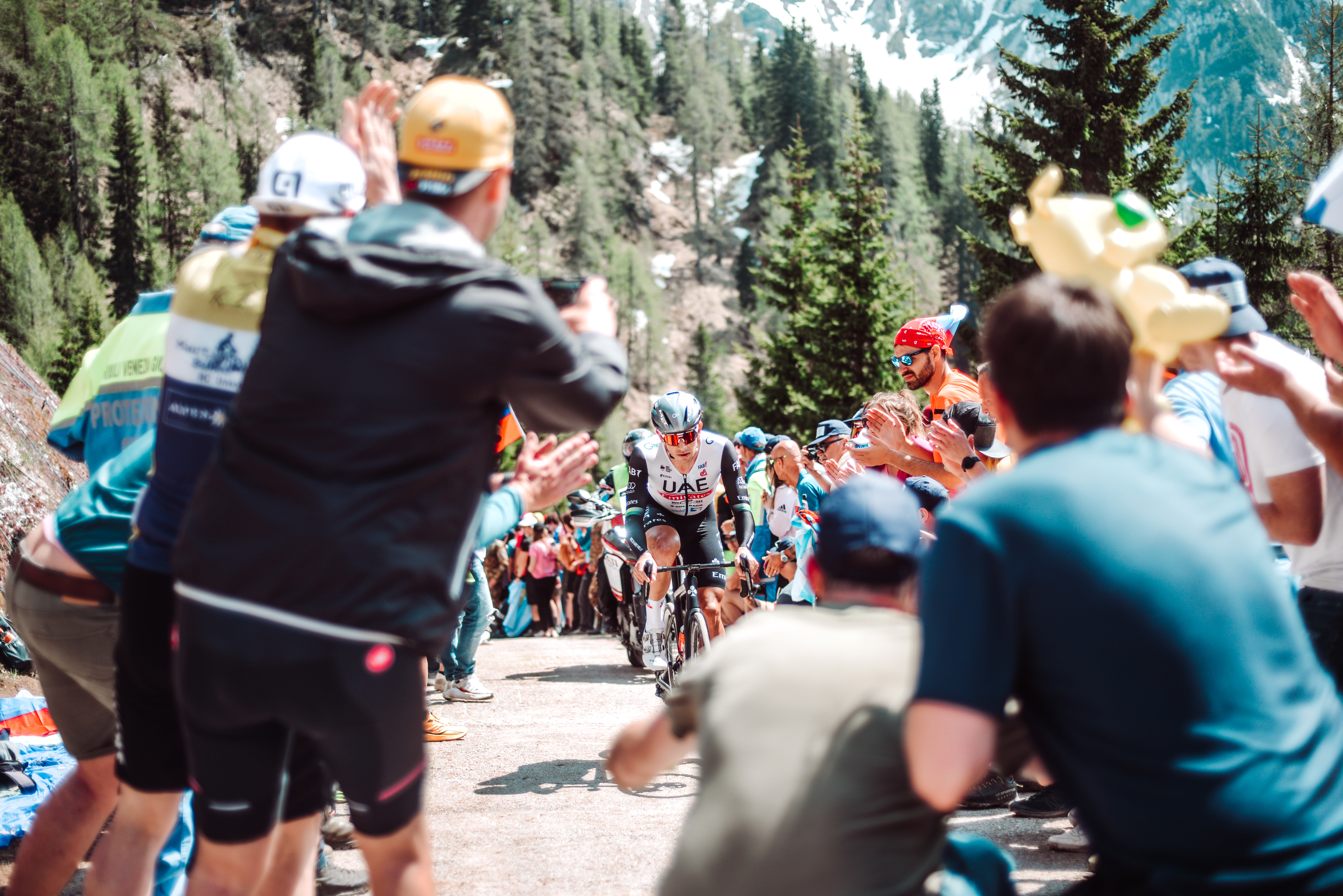 Nel punto più duro, poco prima dello scollinamento verso l’arrivo, la gente combatte l’insolazione con la birra mentre le montagne striate di neve sono abbaglianti nella luce del mezzogiorno. Scalare questo posto da solo deve essere equiparato ad una specie di tortura espiatoria, chilometri in mezzo ai boschi in cui la strada non concede pietà praticamente mai. Ma con questa festa attorno è un’altra cosa, deve essere scientificamente provato che il tifo migliori le prestazioni, di non so che percentuale perchè i calcoli non sono fatti per giornate come queste, dove la corsa alla rosa chiede di dare il tutto e per tutto, di essere composti in salita per guadagnare secondi quando vorresti solo lasciarti piegare dallo sforzo e fregartene del resto.