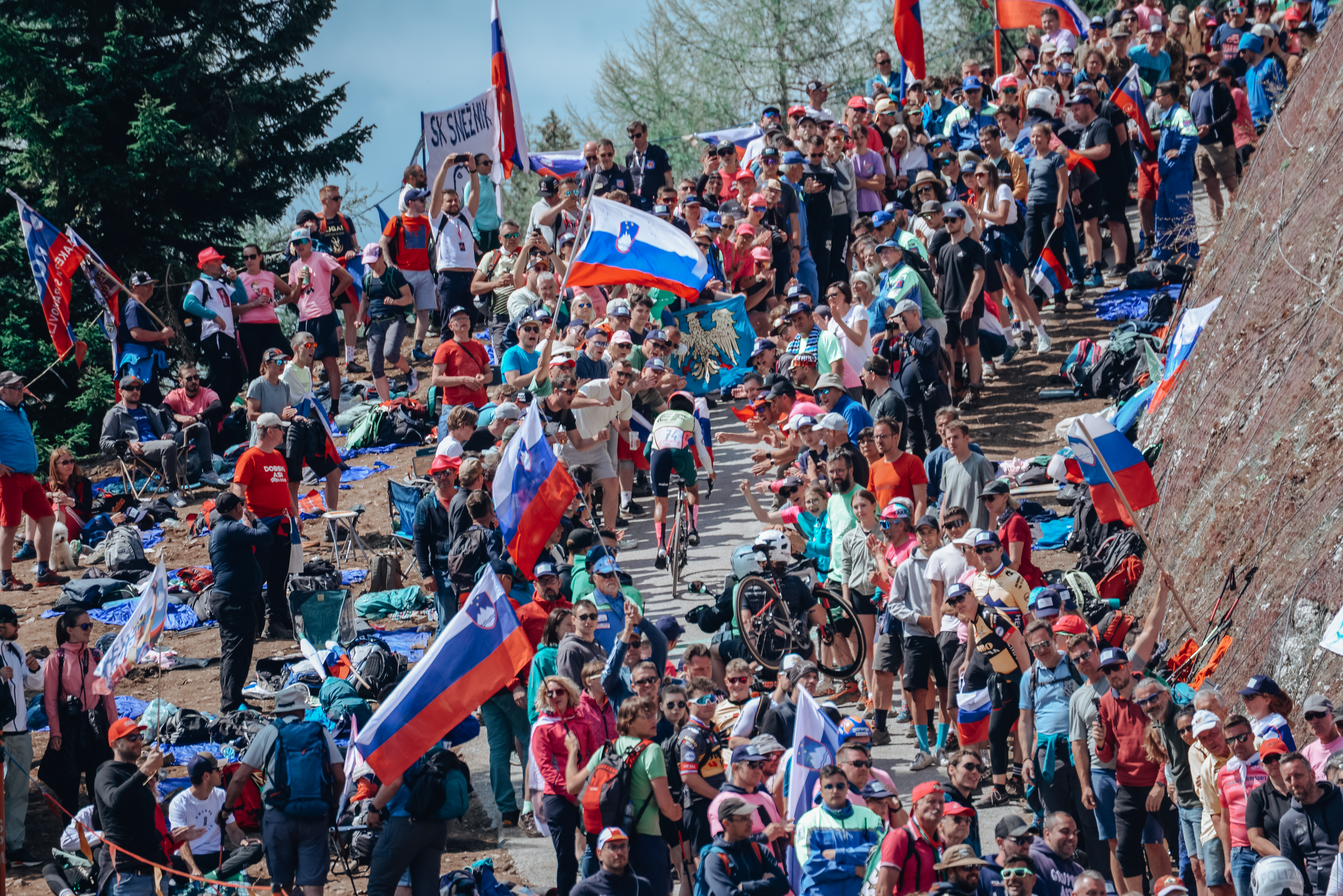 Qui oggi è territorio degli sloveni che sono venuti per chiedere un miracolo in una tappa che tutti stanno aspettando dal minuto zero, un po’ perché è la più surreale di tutte, un po’ perché è forse la più tremenda, come confermano i ciclisti del primo blocco che arrivano stravolti, senza fiato e senza neanche la forza di riconoscere la gente che gli sta attorno. Lo scenario è straordinario ed apocalittico, lontano dal mondo, lontano da tutto, pieno zeppo di gente che al ciclismo darebbe tutto. Tuttavia, mi sembra assurdo che possa succedere qualcosa, anche se Roglic conosce queste strade da sempre ed è stato l’unico a fare la recon in bicicletta stamattina. Nel 2023 è così raro che le carte vengano rimescolate a questo punto, a meno che il destino voglia farlo, in un modo o nell’altro.