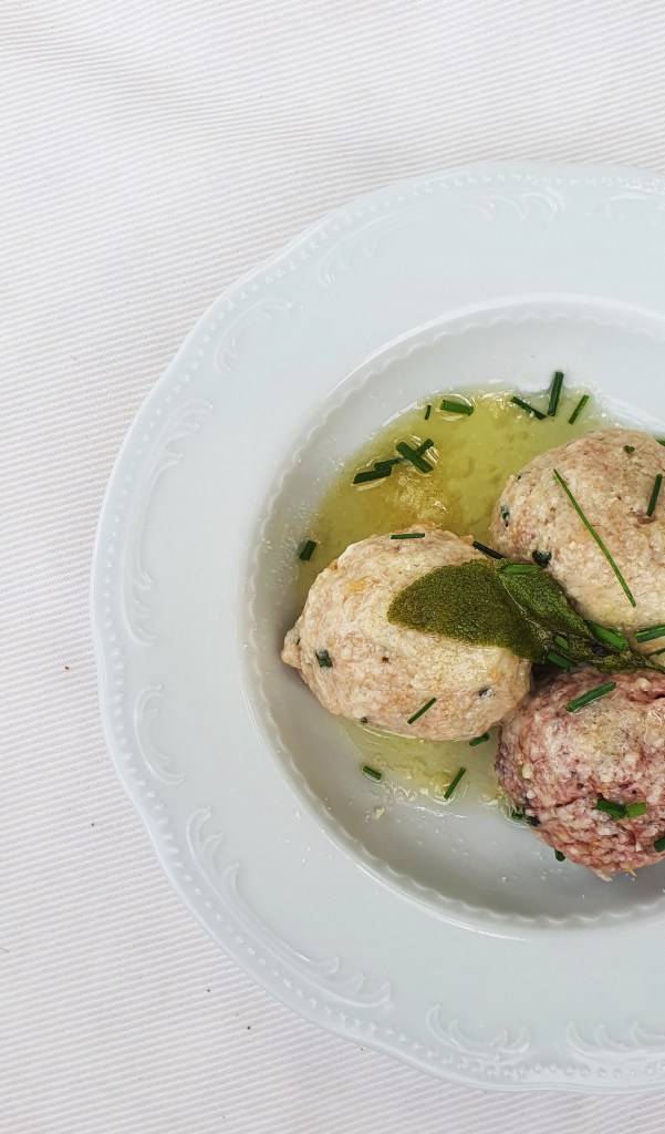 Un sacco di poesia che però non può fare a meno della sua prosa, incarnata in un tris di canederli immersi nel burro, buoni che vorrei mangiare anche il piatto. Per fortuna resta il posto per il dolce: io prendo una panna cotta fatta in casa e la Vale si lancia su una torta alle ciliegie non molto pratica da mangiare, in effetti.