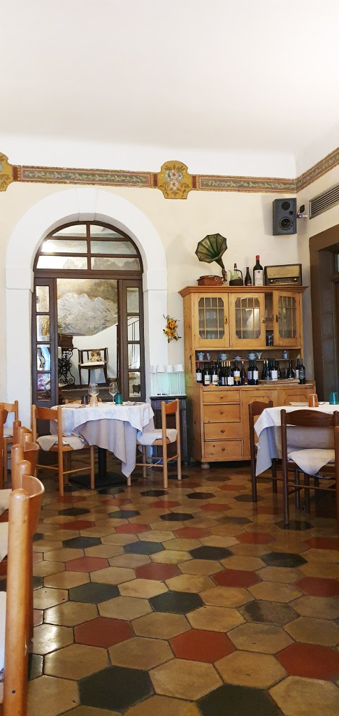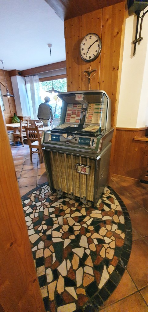 Invece, inaspettatamente, la signora ci guida all’interno e ci apre la porta dell’armadio di Narnia: al suo interno c’è una stanza vuota e fresca con il pavimento che sembra quello di un’antica cappella – mi fa impazzire – e i tavoli di legno con le tovaglie bianche. Qua e là il trash si mescola al vintage con Trompe-l’Oeil alle pareti con vedute di chissà che, grammofoni con fiori di plastica e lui…il juke box, signore del locale. Alla fine sto per cinque minuti a guardare le canzoni e non ce ne è una che mi piace. Tipico.
