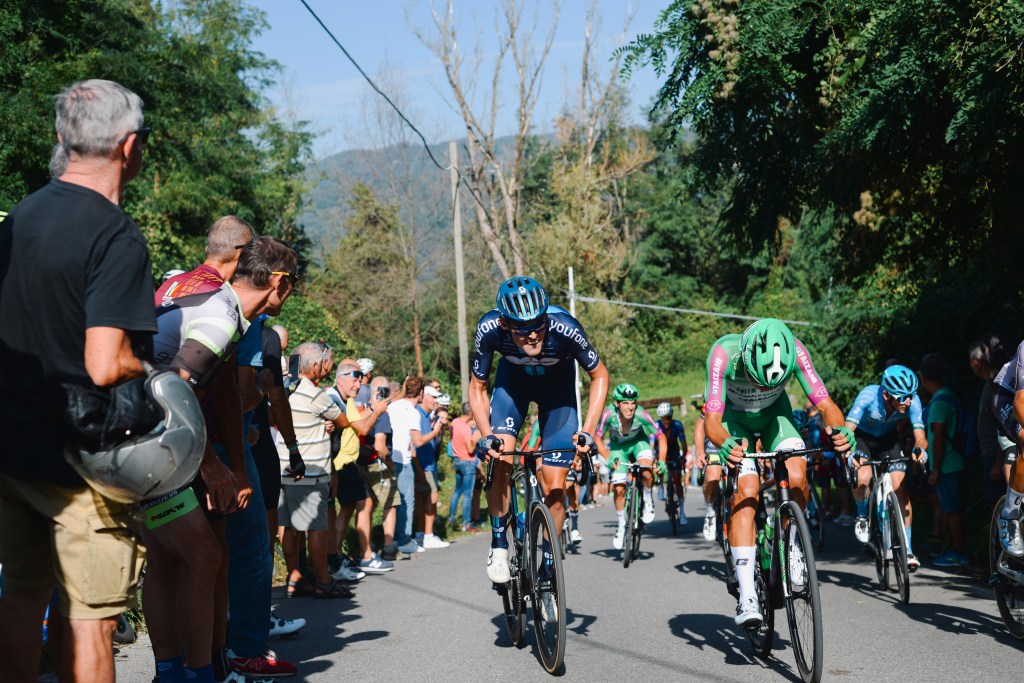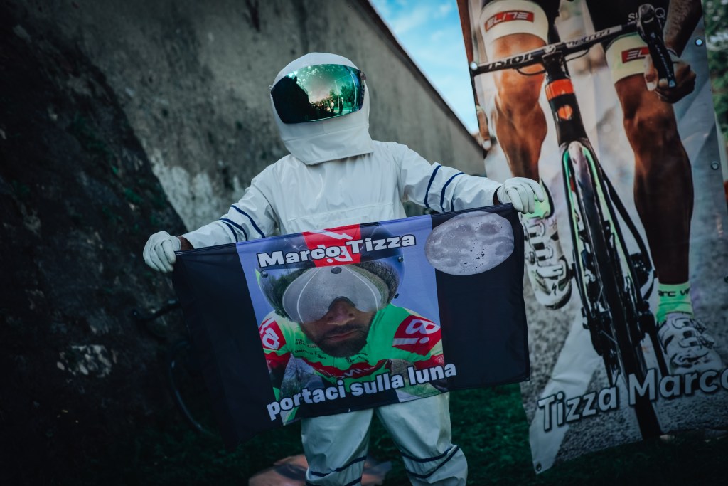 Sul Lissolo la luce è ingestibile come sempre, con le maledette robinie che mettono chiazze di ombre nette e il sole di settembre che dovrebbe essere dolce e malinconico ma qua è solo assassino, con quelle rampe che sbucano dal bosco dove è letteralmente impossibile fare delle foto normali. Il fan club di Marco Tizza ha un faccione gigante di lui e un astronauta atterrato da chissà dove che fa il caffè alla gente che passa mentre il sole ha ancora il potere di farti sentire un ghiacciolo a ferragosto nelle mani di un bambino di otto anni. Il ciclismo è fatto per portarti altrove, su un altro pianeta per esempio, per mettere in pausa la vita, lasciare il resto fuori, galleggiare nello spazio, raggiungere il Nirvana.