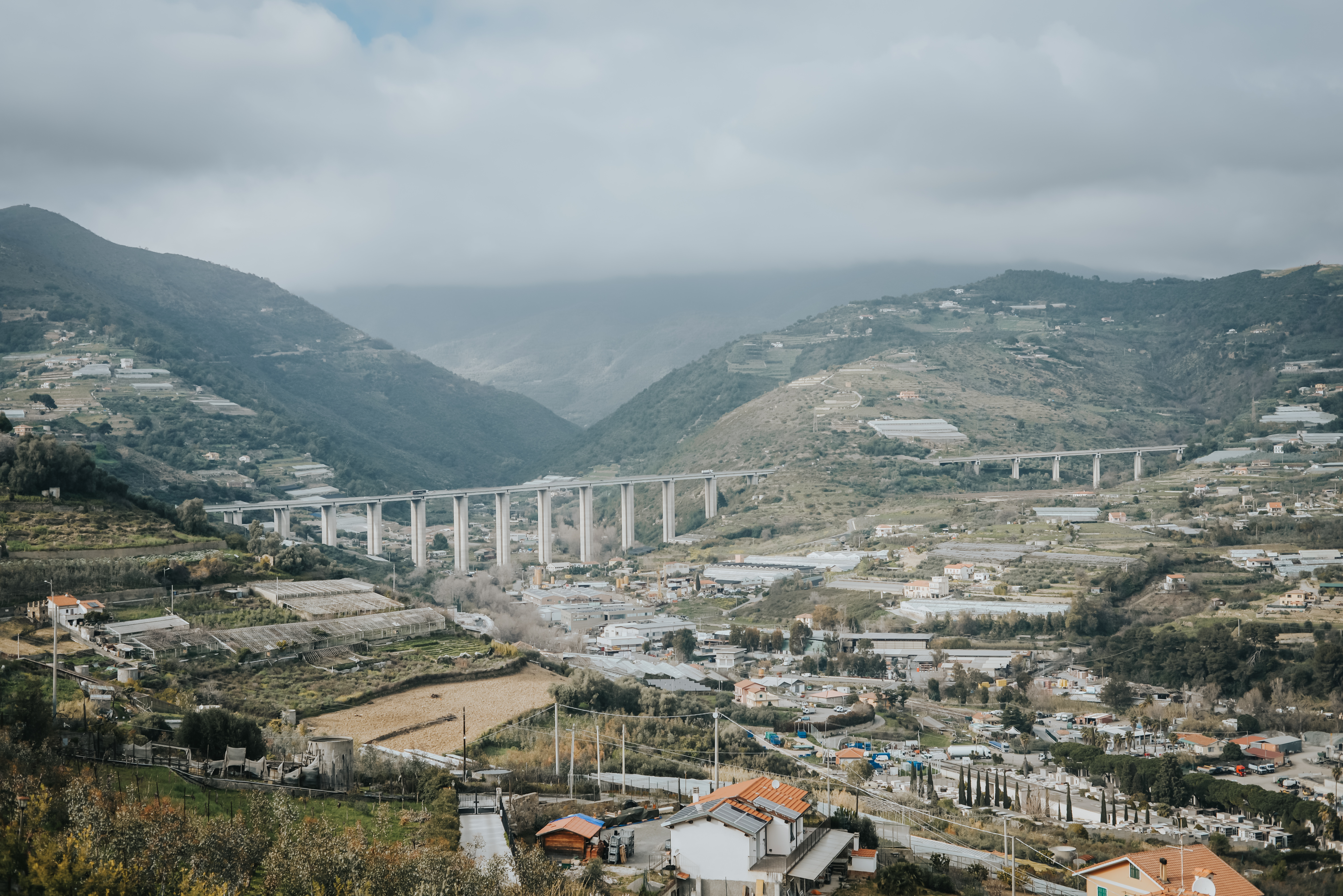 I limoni gialli e floridi fanno da cornice alla pennellata di mare laggiù in fondo. In mezzo, qualsiasi cosa: fiori bianchi rampicanti, le grandi cisterne di cemento colme di acqua torbida che non riflettono niente, carcasse di macchine, serre con i vetri rotti, paesi abbandonati. Il viadotto è praticamente dipinto sulle colline in un quadro di Turner dove le campate sono quelle di un ponte antico che sormonta chissà quale servaggio fiume impetuoso.