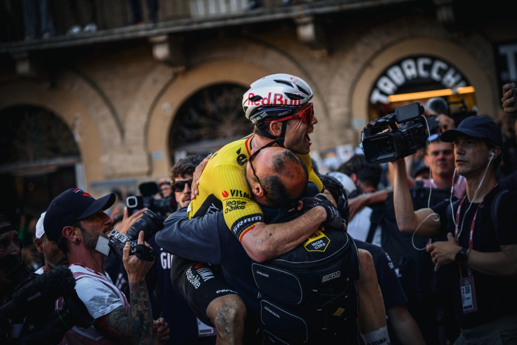 Sono queste le giornate in cui la gente inneggia ai loro favoriti soltanto perchè sono là davanti, dimenticandosi delle regole non scritte che sono come la stretta di mano del tuo amico fraterno. La verità è che il pubblico vuole cani che si sbranano nell’arena, lo spettacolo di un carnaio senza etica, senza prezzo. Tra il sangue che sgorga dalla gamba di Ayuso e le assurde lacrime di un bambino che voleva arrampicarsi su una sedia per sembrare più grande, si alza Van Aert come un eroe della rivoluzione. Il pugno al cielo come la Marianne della Libertà che guida il popolo di Delacroix, un quadro vivente in pratica: il condottiero che redime una giornata che avrebbe dovuto essere dimenticata.
