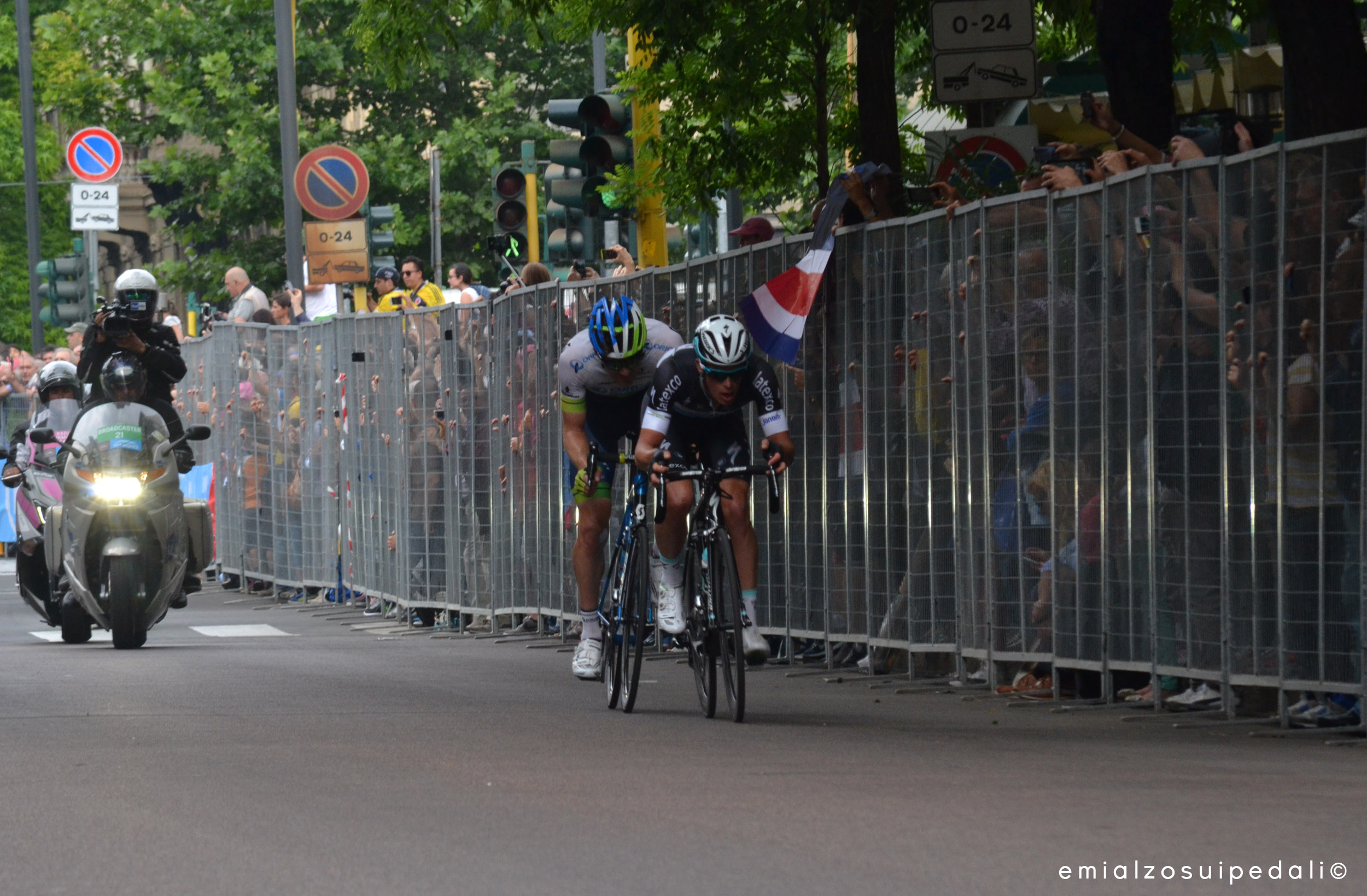 Also for the cyclists, today, this city is a bit like home. Six circuit laps and then the Heaven that has the perfume, the voices, the sounds of an amplified arrival. Milano is all they’ve dreamt in these days. Milano is the end. Milano is here, now. Corso Sempione which stops, a bit of sun that peeps out, the people attached to the barriers. And the screams at every passage, the love for everybody, without knowing the name. This hug is for each one of them. From the group Ikjo Keisse and Luke Dubrige escape. They “go like trains” in that city circuit that seems strange without traffic. Snaps a traffic light on the corner of the street. Red, yellow, green. For this time it remains ignored.