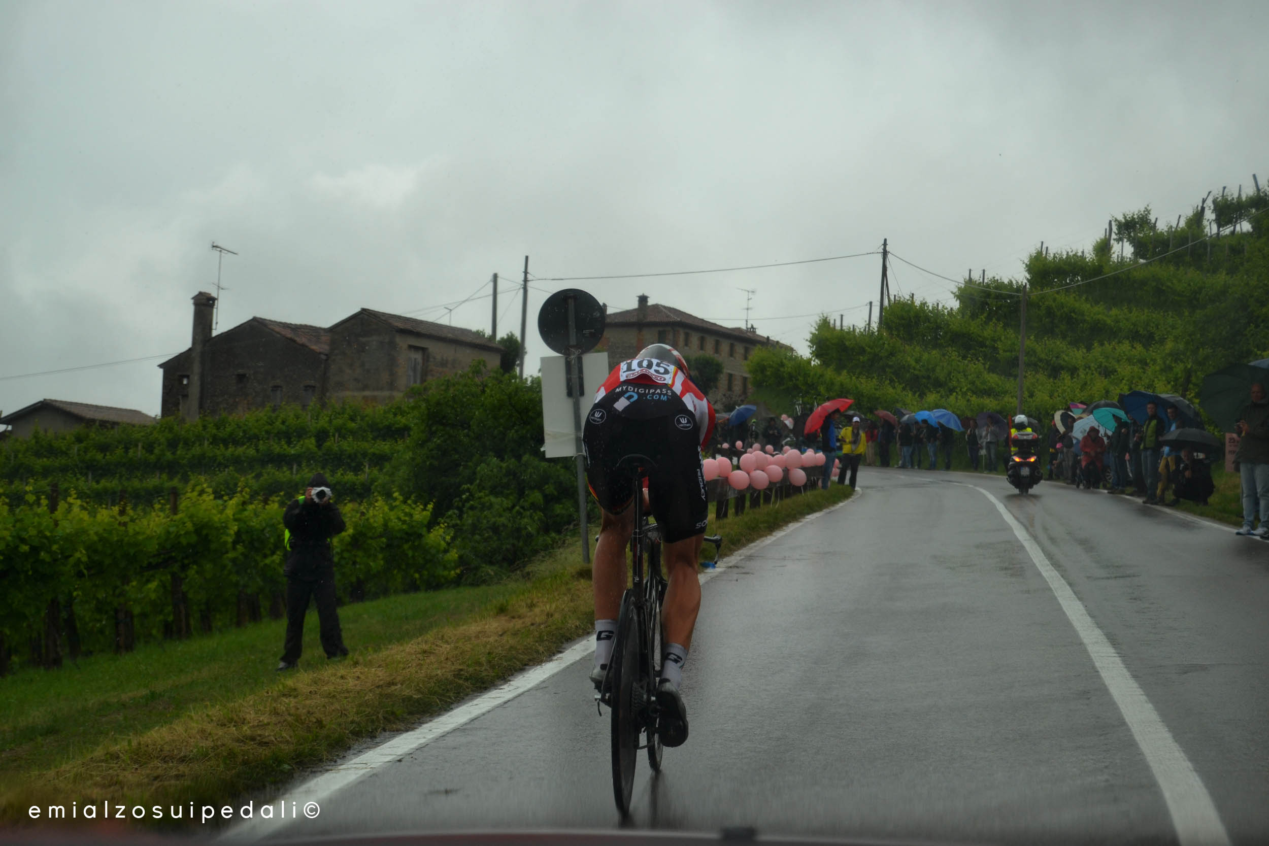 This page is humid, that kind of humidity you feel into the bones when you spend hours waiting for cycling. It has the smell of the strange autumn of May that there was at Valdobbiadene. Smell of smoke that seemed to be the roast chestnuts’ one. I’ve felt the cold just later, after that Contador came with his eyes fixed on the screen to be sure he had stolen Aru’s time in a day that must have been his. Despite falls, despite the shoulder, despite everything. After that Aru came in a pink that wasn’t his anymore, grimace of fatigue under the pouring rain. Because cycling is something that warms you up. Indeed no. It is something that makes you go over all, even over the rain. You just think of being there.