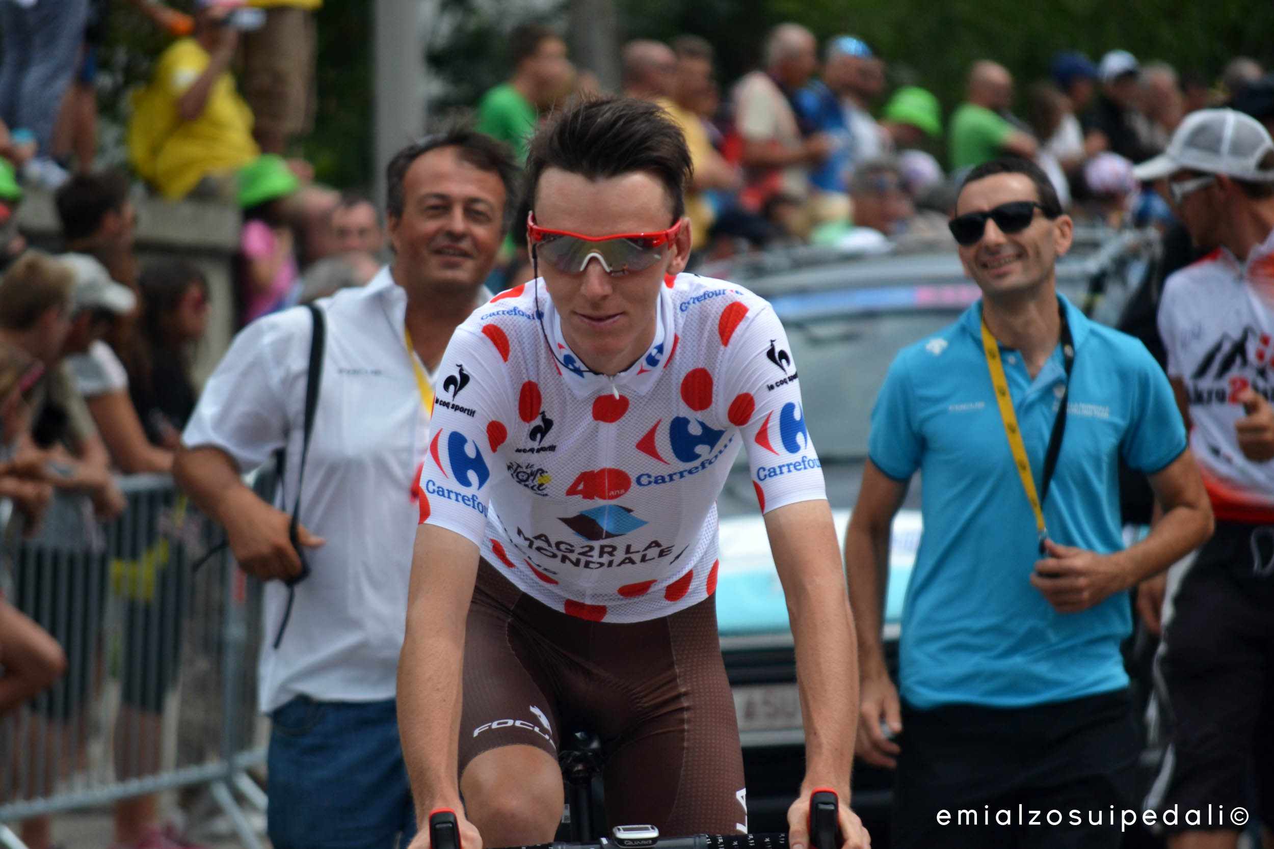Chris Froome does the rollers in front of his bus with some mates, Romain Bardet passes, a child tells to another:”C’est la maillot a pois!”