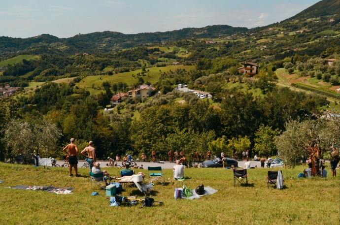 Le Vespe 125 Primavera parcheggiate all’ombra, l’odore della frutta matura cotta dal sole, i vecchi incollati alle loro sedie di vimini davanti a tavole imbandite di damigiane di vino ghiacciato, le birre al fresco riposante dei frigo bar trascinati in cima dalla gente a torso nudo e Gigi Dag negli altoparlanti, perso nelle colline immerse…